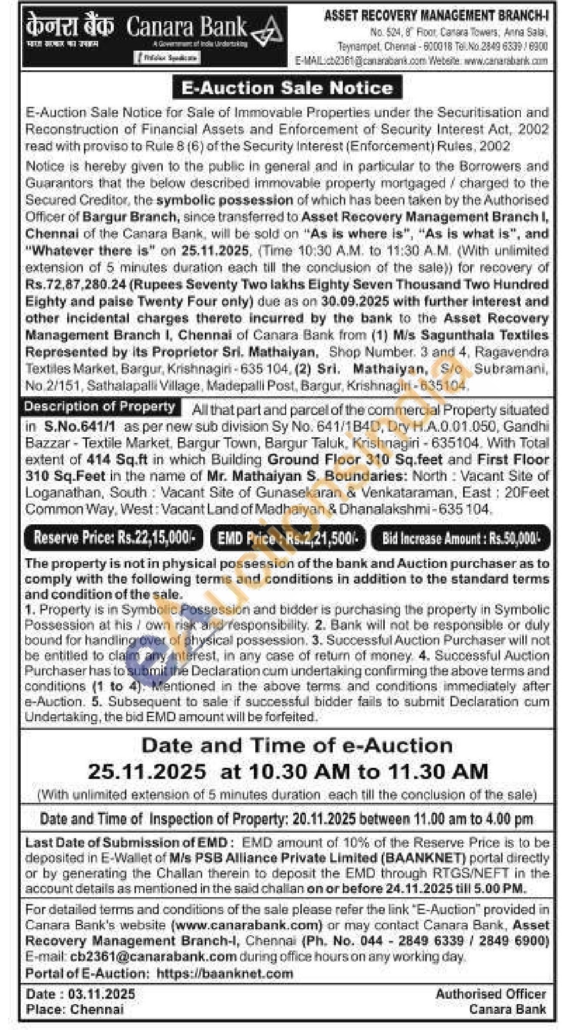 All that part and parcel of the commercial Property situated in S.No.641/1 as per new sub division Sy No. 641/1B4D, Dry H.A.0.01.050, Gandhi Bazzar-Textile Market, Bargur Town, Bargur Taluk, Krishnagiri-635104. With Total extent of 414 Sq.ft in which Building Ground Floor 310 Sq.feet and First Floor 310 Sq.Feet in the name of Mr. Mathaiyan S. Boundaries: North: Vacant Site of Loganathan, South: Vacant Site of Gunasekaran & Venkataraman, East: 20Feet Common Way, West: Vacant Land of Medhaiyan & Dhanalakshmi-635 104
