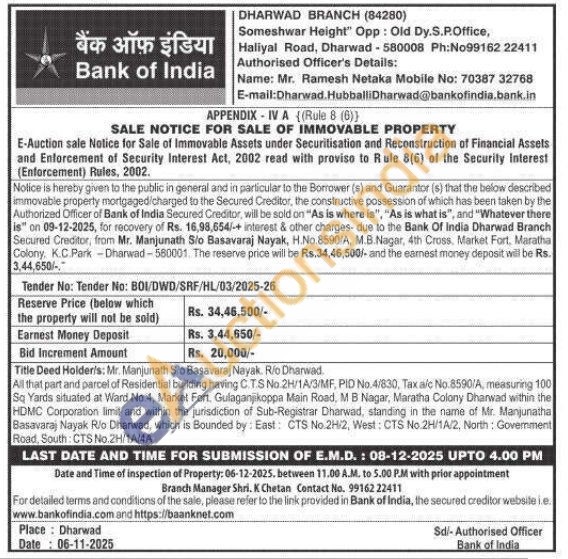 All that part and parcel of Residential building having C.TS No.2H/1A/3/MF, PID No.4/830, Tax a/c No.8590/A, measuring 100 Sq Yards situated at Ward No.4, Markat Fort. Gulaganjikoppa Main Road, MB Nagar, Maratha Colony Dharwad within the HDMC Corporation limit and within the jurisdiction of Sub-Registrar Dharwad, standing in the name of Mr. Manjunatha Basavaraj Nayak R/o Dharwad, which is Bounded by: East: CTS No.2H/2, West: CTS No. 2H/1A/2, North: Government Road, South: CTS No.2H/1A/4A