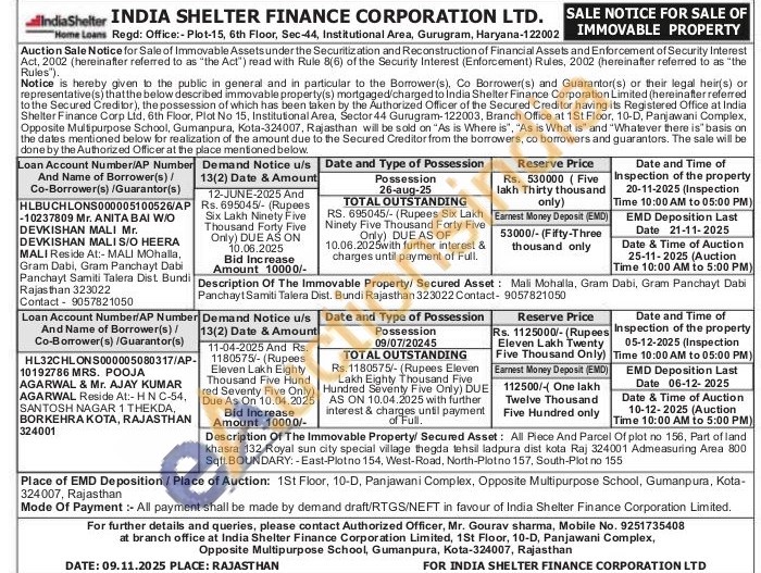 Description Of The Immovable Property/ Secured Asset: Mali Mohalla, Gram Dabi, Gram Panchayt Dabi Panchayt Samiti Talera Dist. Bundi Rajasthan 323022 Contact-9057821050