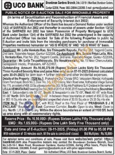 Details of the Property: (TEM No.1: Prakashan Dist, Chirala SRO, Vetapalem Mandal, Kothapela Gram Panchayat, Block No.3, Door No. 3-5, ILTD Colony, Main Road area, Kothapeta Village Survey No. 178, an extent of 458 33 Sq yds equivalent to 383.16 Sq.mts Prabhava SUR Enclave in the name of LELLA VENKATA RAO bearing Doc No. 2909 of 2015 ct 19.06.2015 having the following Boundries: East: Y. Satyavodam's site 56-00, South: B. Yesupadam's sile 75'-00', West: 60-00 wide Road 55-00 North: SKN Saheb's site 75-00". In between these boundaries an extent of 458.33 Su yds or 383.16 Sq.mts site, an undivided and unspecified share of 30.55 Sq yds or 25.35 Sq rits site