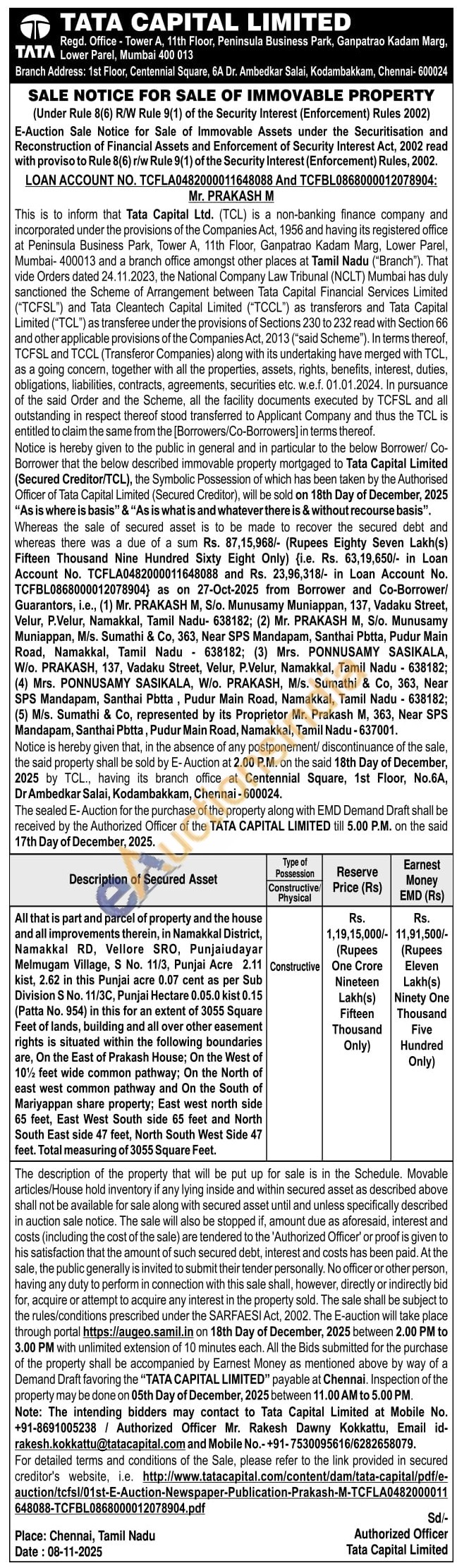 All that is part and parcel of property and the house and all improvements therein, in Namakkal District, Namakkal RD, Vellore SRO, Punjaiudayar Melmugam Village, S No. 11/3, Punjai Acre 2.11 kist, 2.62 in this Punjai acre 0.07 cent as per Sub Division S No. 11/3C, Punjai Hectare 0.05.0 kist 0.15 (Patta No. 954) in this for an extent of 3055 Square Feet of lands, building and all over other easement rights is situated within the following boundaries are, On the East of Prakash House; On the West of 10½ feet wide common pathway; On the North of east west common pathway and On the South of Mariyappan share property; East west north side 65 feet, East West South side 65 feet and North South East side 47 feet, North South West Side 47 feet. Total measuring of 3055 Square Feet