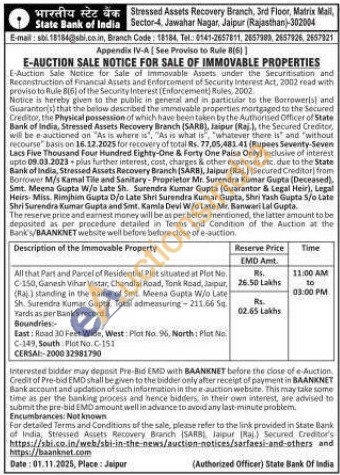 All that Part and Parcel of Residential Plot situated at Plot No C-150, Ganesh Vihar Vistar, Chandlai Road, Tonk Road, Jaipur (Raj) standing in the name of Smt. Meena Gupta Wilo Late Sh. Surendra Kumar Gupta. Total admeasuring-2116654 Yards as per Bank srecord