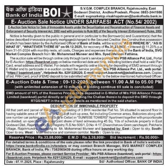 All that part and parcel of the property consisting of 3 BHK residential Flat No. 3A situated in second floor in having salable area of 1300 SqFt (1200 Sqft built-up area, flat including Common areas, Balconies along with one number car parking area(100 Sqft) in Cellar) in "SUNRISE TOWERS" Apartment together with proportionate un-divided, un-specified, un-equal joint share of land admeasuring 45 Sq. Yds of schedule property in East Godavari Dist. Rajahmundry Sub Registry, R.S.No-505/1, D.No-4-17. Diwancheruvu Gram panchayati, Palcharla Village, Rajahmundry, belonging to Mr. Mohammad Muneer and bounded by: East: Open to sky, South: Open to sky, West: Main entrance and common corridor, North: Open to sky.