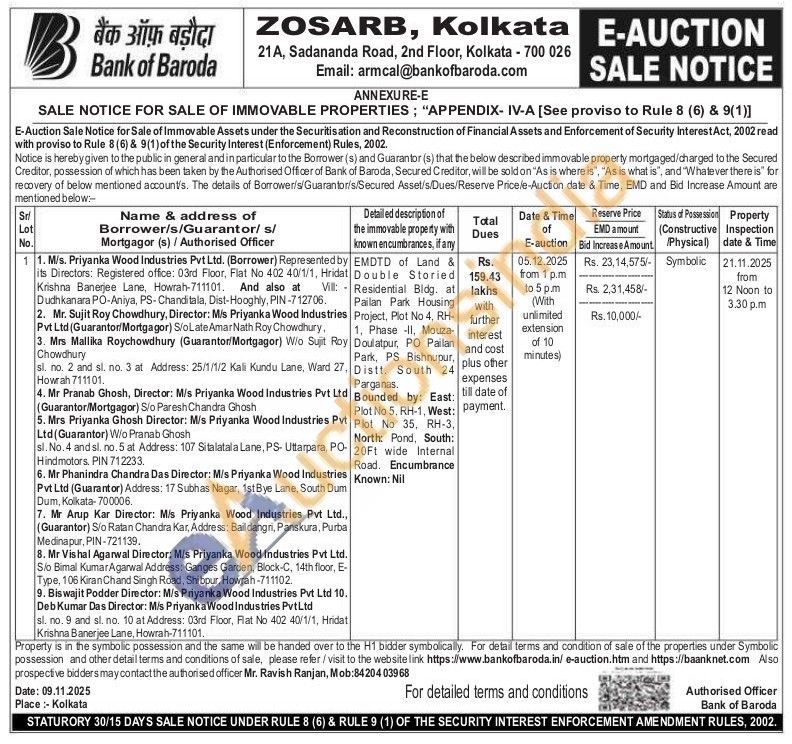 EMDTD of Land & Double Storied Residential Bldg. at Pailan Park Housing Project, Plot No 4, RH-1, Phase II, Mouza Doulatpur, PO Pailan Park, PS Bishnupur, Distt. South 24 Parganas.Bounded by: East: Plot No 5, RH-1, West: Plot No 35, RH-3, North: Pond, South: 20ft wide Internal Road. Encumbrance Known: Nil
