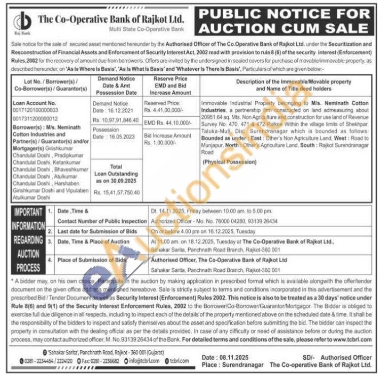 Immovable Industrial Property belonging to Mis. Neminath Cotton Industries, a partnership firm constructed on land admeasuring about 20951.64 sq. Mts. Non Agriculture and construction for use land of Revenue Survey No. 470, 471 & 472 Paikee Within the village limits of Shekhpar, Taluka-Muli, Dist. Surendranagar which is bounded as follows: Bounded as under: East: Other's Non Agriculture Land. West: Road to Munjapur, North: Other's Agriculture Land, South: Rajkot Surendranagar road
