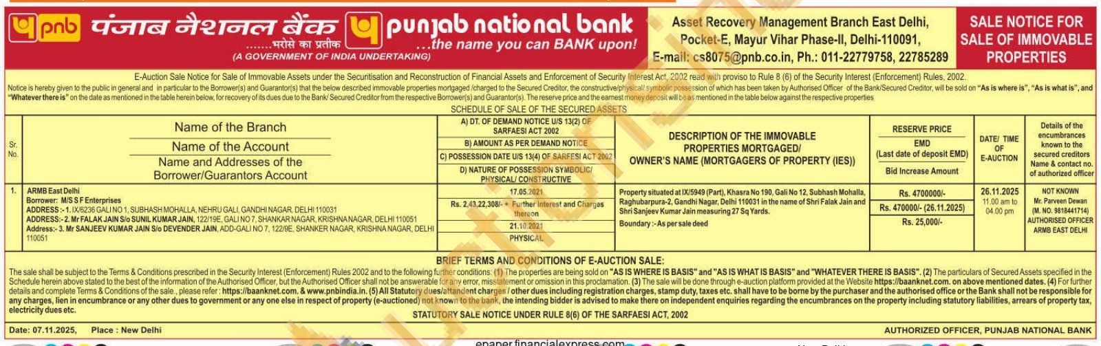 Property situated at IX/5949 (Part), Khasra No 190, Gali No 12, Subhash Mohalla, Raghubarpura-2, Gandhi Nagar, Delhi 110031 in the name of Shri Falak Jain and Shri Sanjeev Kumar Jain measuring 27 Sq Yards.