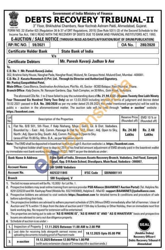 Flat No. 8/8 501, 5th Floor, F Kalp Nishang, Moje Gotri, Tal. & Dist. Vadodara. Bounded by: East: Adj. Comm. Passage & Flat No. 502, West: Adj. Open to Sky, North: Adj. Open to Sky, South: Adj. Comm. Passage & Open to Sky. (area of Flat 79.80 Sq. Mtrs. B.A., as per Valuation report)