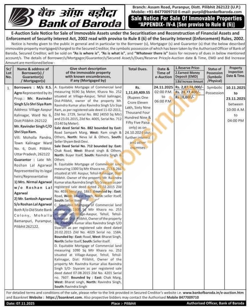 Equitable Mortgage of Commercial land measuring 9190 Sq Meter, Khasra No. 252 situated at Village-Aaspur, Tehsil kalinagar, Dist-Pilibhit, owner of the property Mr. Ravindra Kumar alias Ravindra Singh S/o Siya Ram, as per registered sale deed 11-02-2011, Zild No. 2729, Serial No. 882 (4050 Sq Mtr) and 23.01.2015, Zild No. 4005, Serial No. 712 (5140 Sq Meter