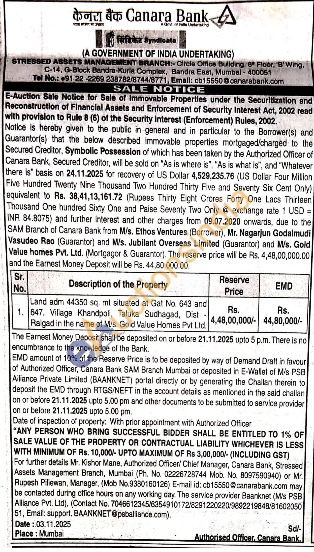 Land adm 44350 sq. mt situated at Gat No. 643 and 647, Village Khandpoli, Taluka Sudhagad, Dist -Raigad in the name of M/s. Gold Value Homes Pvt Ltd.
