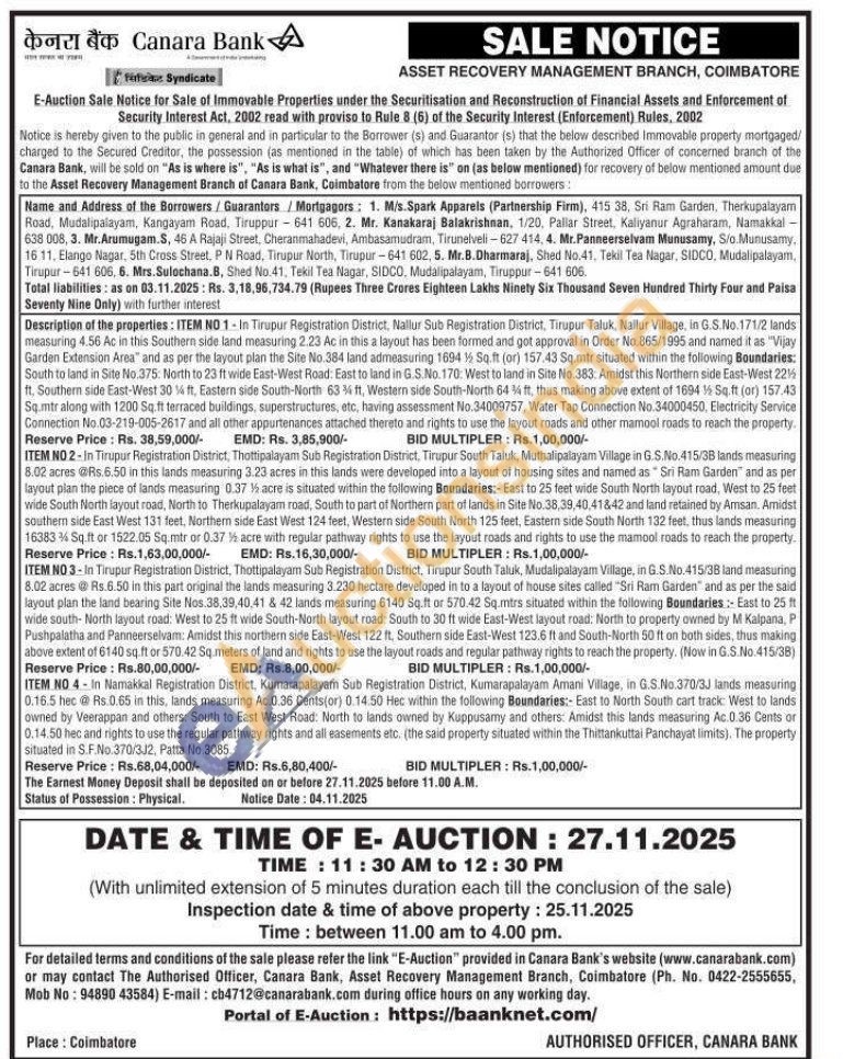 ITEM NO 1-In Tirupur Registration District, Nallur Sub Registration District, Tirupur Taluk, Nallur Village, in G.S.No.171/2 lands measuring 4.56 Ac in this Southern side land measuring 2.23 Ac in this a layout has been formed and got approval in Order No.865/1995 and named it as "Vijay Garden Extension Area" and as per the layout plan the Site No.384 land admeasuring 1694 % Sq.ft (or) 157.43 Sq.mtr situated within the following Boundaries: South to land in Site No.375: North to 23 ft wide East-West Road: East to land in G.S.No. 170: West to land in Site No.383: Amidst this Northern side East-West 22% ft. Southern side East-West 30% ft, Eastern side South-North 63% ft, Western side South-North 64 % ft, thus making above extent of 1694 15 Sq.ft (or) 157.43 Sq.mtr along with 1200 Sq.ft terraced buildings, superstructures, etc, having assessment No.34009757, Water Tap Connection No.34000450, Electricity Service Connection No.03-219-005-2617 and all other appurtenances attached thereto and rights to use the layout roads and other mamool roads to reach the property
