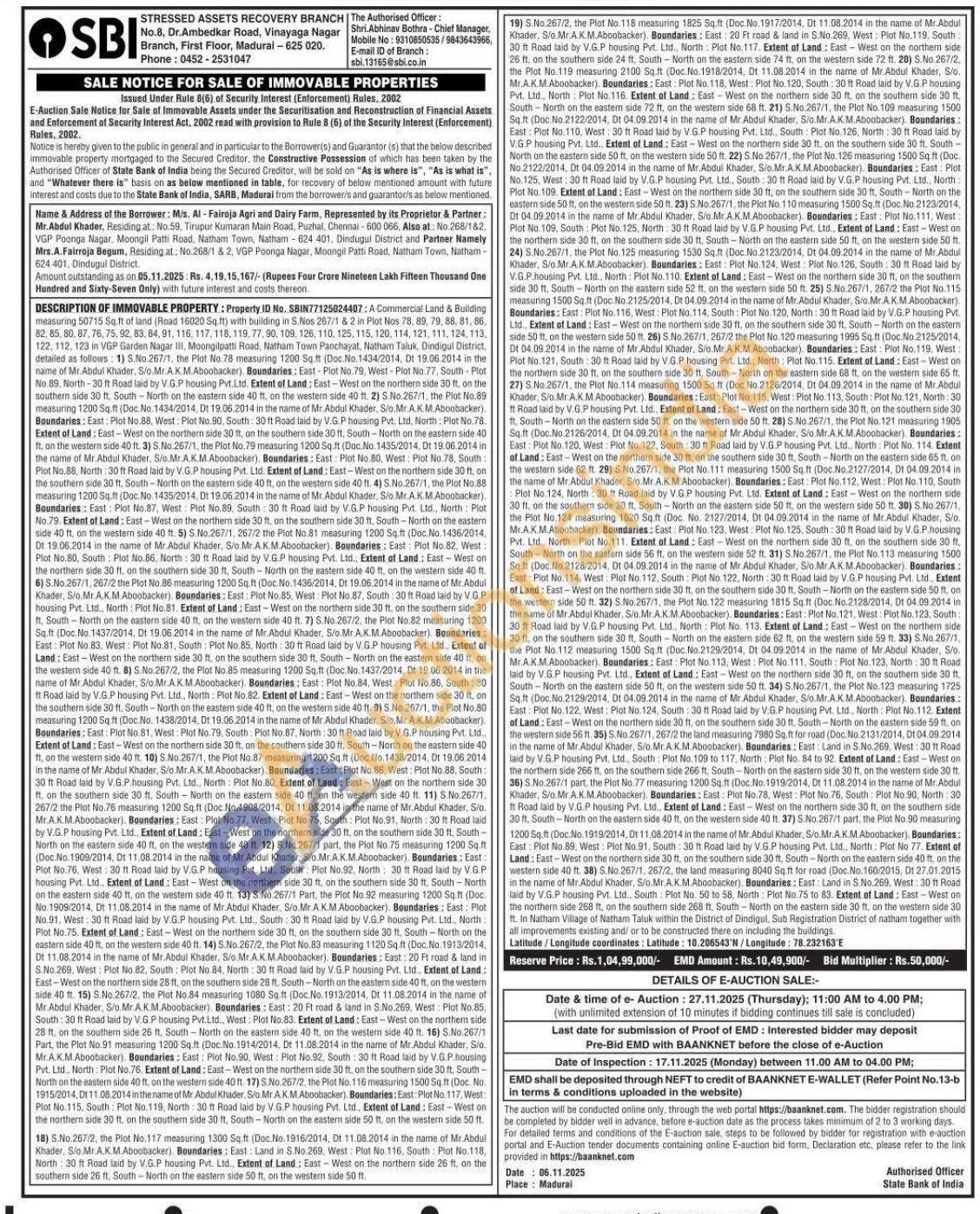 DESCRIPTION OF IMMOVABLE PROPERTY: Property ID No. SBIN77125024407: A Commercial Land & Building measuring 50715 Sg. It of land (Road 16020 Sq.) with building in S. Nos 287/1 & 2 in Plat Nos 78, 89, 79, 88. 81,86. 82.85, 80.87,76,75,02, 83.84,01, 116, 117, 118, 110.77.90, 109, 126, 110, 125, 115, 120, 114, 121, 111, 124, 113, 122, 112. 123 VSP Garden Nogar III. Moongilpatti Road, Mathum Town Panchayat, Natham Taluk. Dindigul District, detailed as follows: 1) S.No 267/1, the Plot No. 78 measuring 1200 5qft (Doc. No 1434/2014, Dt 19.06.2014 in the name of Mr.Abdul Khader. SAMA.K. M. Abohacker). Boundaries: East Plot No. 79. West-Plot No 77. South-Plot No.89, North-30 ft Road laid by VGP housing Pvt.Ltd. Extent of Land: East-West on the northern side 300 ft, on the southern side 30 ft. South-North on the eastern side 40 ft. on the western side 40 tt. 23 5.No 267/1, the Plot No.09 measuring 1200 g t (Doc. No 1434/2014. 01 19.06.2014 in the name of Mr. Abd Abdul Khader, Slo Mr.AK.M.Aboobacker) Boundaries: East Plot No.SK, West Plot No.910. South: 30 ft Road laid by VG.P housing Pvt. Ltd, North: Plot No 71. Extent of Land: East-West on the northern side 30 ft, on the southern side 30 ft. South-North on the eastern side 40 ft, on the western side 40 ft. 3) 5. No. 267/1, the Plat No.79 measuring 1200 Sq.ft (Dac N 1435/2014, 01:19.06.2014 in the name of Mr.Abdul Khader, S/Mr.A.K.M.Aboobacher), Boundaries: East Plot No.80, West: Plot No.78, South Plot No.88, North: 30 ft Road laid by V.G.Phousing Pvt. Ltd. Extent of Land: East-West on the northern side 30 ft. on The southern side 30 ft. South-North on the eastern side 40 tt, on the western side 40 ft. 4) S.No.267/1, the Plot No.88 measuring 12005 1200 Suft (Doc. No. 1435/2014. Di 19.06.2014 in the name of Mr Abdul Khader. Sio Mr.A.K.M.Aboobacker) Boundaries: East: Plot No.87, West Pist No.80, South: 30 ft Road laid by V.G.P housing Pvt. Ltd., North Plot No.79 Extent of Land: East-West on the northern side 30 ft on the southern side 30 ft, South-North on the eastern side 40 tt, on the westem side 40 ft. 5.№267/1,267/2 the Plot No 81 measuring 1200 Soft (Dec. No. 1436/2014 Dt 19:06 2014 in the name of Mr.Abdul Khader. Su Mr. A.K.M.Abochucker). Boundaries: East: Plot No.82. Wint Pict No. 50. South Plot No.86, North: 30 tr Road laid by VG.P housing Pvt. Ltd., Extent of Land: East-West on the northern side 30 ff, on the southern side 30 ft. South-North on the eastem side 40 ft, on the westem side 40 ft 5267/1,2672 1.267/2 the the Plat Plot No N B meaturing 1200 5 ft (Doc No 1436/2014. Dt 19.06.2014 in the name of Mr. Abdul Khader, Sio Mr.A.K.M.Aboobacker). Boundaries: East: Plot No.fi. West Plot No 17, South: 30 ft Road laid by VGP housing Pvt. Ltd., North: Plot No.81. Extent of Land: East-West on the northem side 30 ft. on the southern side 30 ft. South-North on the eastern side 40 on the westernt side 40 tt. 7) 5. No 267/2, the Plot No.82 measuring 1200 Saf (Doc No 1437/2014, Di 19.08.2014 in the name of Mr.Abdul Khader, Sio.Mr.A.K.M.Aboobacker) Boundaries: East: Plot No:83. West: Plot No 81, South Plot No BS, North: 30 ft Road laid by V.G.P housing Pvt. Ltd., Extent of Land: East-West on the northern side 30 ft on the southem side 30 ft. South-North on the eastern sade 40 tt, on the western side 40 ft.) S.No. 267/2, the Plat No 85 measuring 1200 Soft (Doc No. 1427/2014, Dt 19.06.2014 in the name of Mr.Abdul Kader, So Mr.AK.M.Abnotacker). Boundaries: East: Plot No.84, West: Plot No.86 South: 30 ft Road laid by V.G. Phousing Pvt. Ltd., North Plot No 62. Extent of Land: East-West on the northern side 30 ft, on the southem siste 30 ft. South-North on the sattern side 40 ft, on the western side 40 95.No 267/1, the Plot No.00 measuring 1200 Sqft (Doc. No. 1438/2014, 01 19.06.2014 in the name of Mr. Abdul Khader, Sim Mr. A.K. M.Abochacker) Boundaries: East: Par No. 81. West Plot No 79. South Plot No 57. North: 30 ft Road laid by V. G.Phousing Pvt. Ltit, Extent of Land: East-West on the northem side 30 tt, on the southern side 30 ft. South-North on the eastern side 40 ft, on the western side 40 tt. 10) S.No 267/1, the Plot No 87 measuring 1200 5gift (Doc. No 1438/2014, 01 19.06.2014 in the name of Mr. Abdul Khader, S/ Mr.AKM Abootackm). Boundaries: East Plot No.06. West Plot No 88, South 30 ft Road laid by V.6.P.housing Pvt. Ltd. North Plot No 30. Extent of Land: East-West on the northem side 30 ft. on the southem side 30 ft. South-North on the eastern sikde 40 ft, on the westem side 40 . 11) 5.No.267/1, 267/2 the Plot No.76 measuring 1200 Sqft (Doc. No. 1908/2014, Dt 11.06.2014 in the name of Mr.Abdul Khader, Sto. Mr.A.K.M. Aboobador). Boundaries: East: Plot No.77, West: Piut No 75. South Plot No.91, North: 30 ft Road laid by VGP housing Pvt. Ltd. Extent of Land: East-West on the northern side 30 ft, on the southem side 30 ft. South Marth on the eastern side 40 tt. on the westem side 40 ft. 12) 5.flo 267/1 part, the Plot No.75 measuring 1200 S (Doc. No. 1909/2014, Dt 11.08.2014 in the name of Mr Abdul Khader, Sto.Mr.A.K. M.Atioohacker). Boundaries: East: Plot No. 76. West: 30 ft Road laid by V.GP housing Pvt. Ltd., South Plot No.92, North: 30 ft Road laid by VGP housing Pvt. Ltd., Extent of Land: East-West on the northern side 30 ft. on the southerm side 30 ft, South-North on the rastem side 40 t, on the westem side 40 ft. 13) S.No 26771 Fart, the Plot No.02 meaturing 1200 Sq.m (Doc No. 1909/2014, DE 11.08.2014 in the name of Mr Abdul Khader. So Mr.A.KM Aboobacker) Boundaries: East: Piot No.91. West: 30 ft Road laid by VSP housing Pvt. Ltd., South: 30 Road laid by V.S.P housing Pvt. Ltd. North Plot 75. Extent of Land: East-West on the northern side 30 ft, on the southem side 30 ft. South-North on the eastern side 40 ft. on the western side 40 tt. 14) 5.No.267/2, the Plot No. 83 measuring 1120 Sqft (Doc. No. 1913/2014, Dt 11.08.2014 in the name of Mr. Abdul Khader, So Mr.AK.M.Abonbacker). Boundaries: East 20 Ft road & land in S.No.209, West: Plot No.6, So