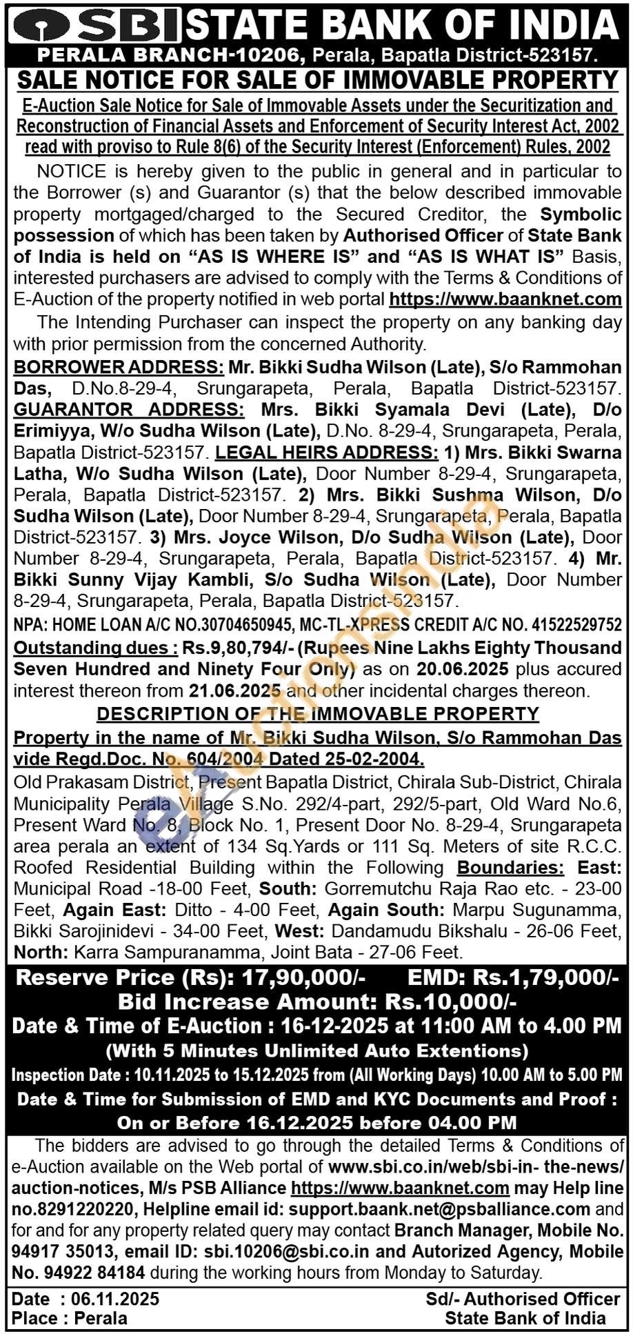 Old Prakasam District, Present Bapatla District, Chirala Sub-District, Chirala Municipality Perala Village S.No. 292/4-part, 292/5-part, Old Ward No.6, Present Ward No. 8, Block No. 1, Present Door No. 8-29-4, Srungarapeta area perala an extent of 134 Sq. Yards or 111 Sq. Meters of site R.C.C. Roofed Residential Building within the Following Boundaries: East: Municipal Road-18-00 Feet, South: Gorremutchu Raja Rao etc. 23-00 Feet, Again East: Ditto 4-00 Feet, Again South: Marpu Sugunamma, Bikki Sarojinidevi - 34-00 Feet, West: Dandamudu Bikshalu - 26-06 Feet, North: Karra Sampuranamma, Joint Bata - 27-06 Feet.