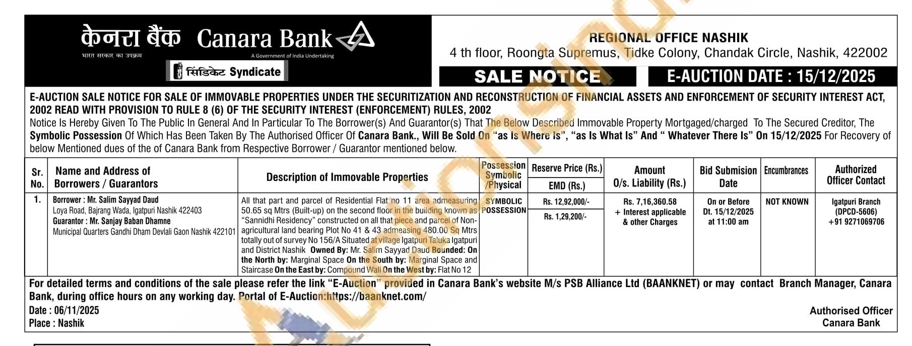 All that part and parcel of Residential Flat no 11 area admeasuring 50,65 sq Mtrs (Built-up) on the second floor in the building known as "Sannidhi Residency constructed on all that piece and parcel of Non-agricultural land bearing Plot No 41 & 43 admeasing 480.00 Sq Mtrs totally out of survey No 156/A Situated at village Igatpuri Taluka Igatpuri and District Nashik Owned By: Mr. Salim Sayyad Daud Bounded: On the North by: Marginal Space On the South by: Marginal Space and Staircase On the East by: Compound Wall On the West by: Flat No 12