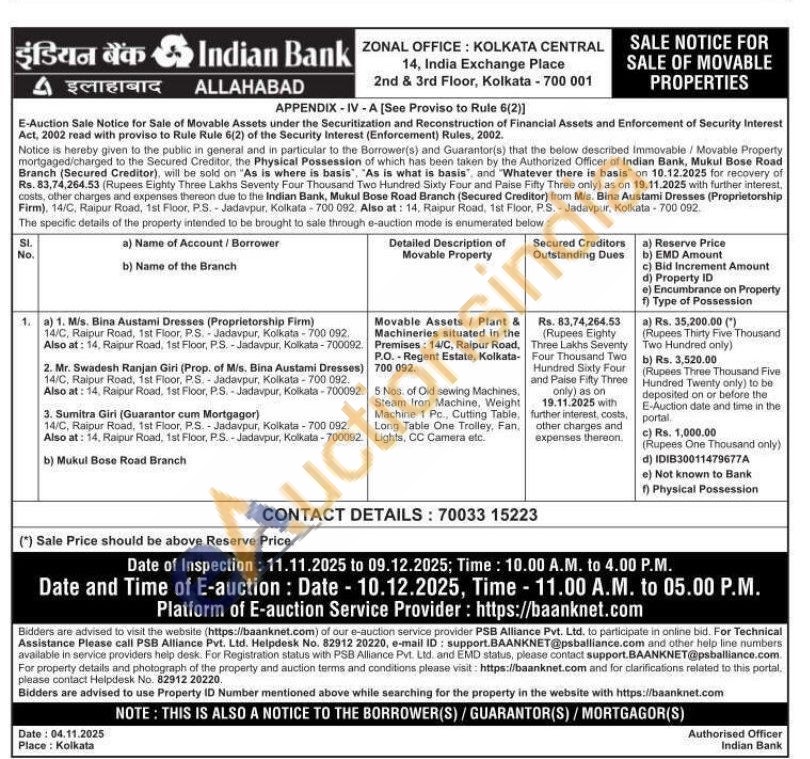 Movable Assets / Plant & Machineries situated in the Premises: 14/C, Raipur Road, P.O. - Regent Estate, Kolkata-700 092. 5 Nos. of Old sewing Machines, Steam Iron Machine, Weight Machine 1 Pc., Cutting Table, Long Table One Trolley, Fan, Lights, CC Camera etc