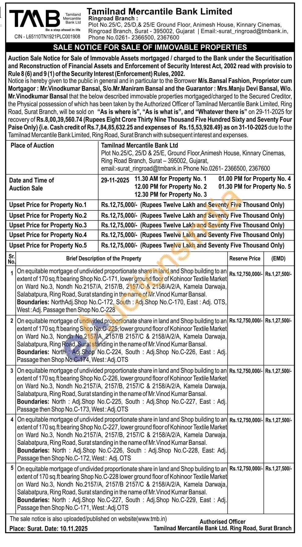 On equitable mortgage of undivided proportionate share in land and Shop building to an extent of 170 sq.ft bearing Shop No. C-226, lower ground floor of Kohinoor Textile Market on Ward No.3, Nondh No.2157/A, 2157/B, 2157/C & 2158/A/2/A, Kamela Darwaja, Salabatpura, Ring Road, Surat standing in the name of Mr. Vinod Kumar Bansal. Boundaries: North Adj. Shop No.C-225, South Adj. Shop No.C-227, East: Adj. Passage then Shop No. C-173, West: Adj.OTS