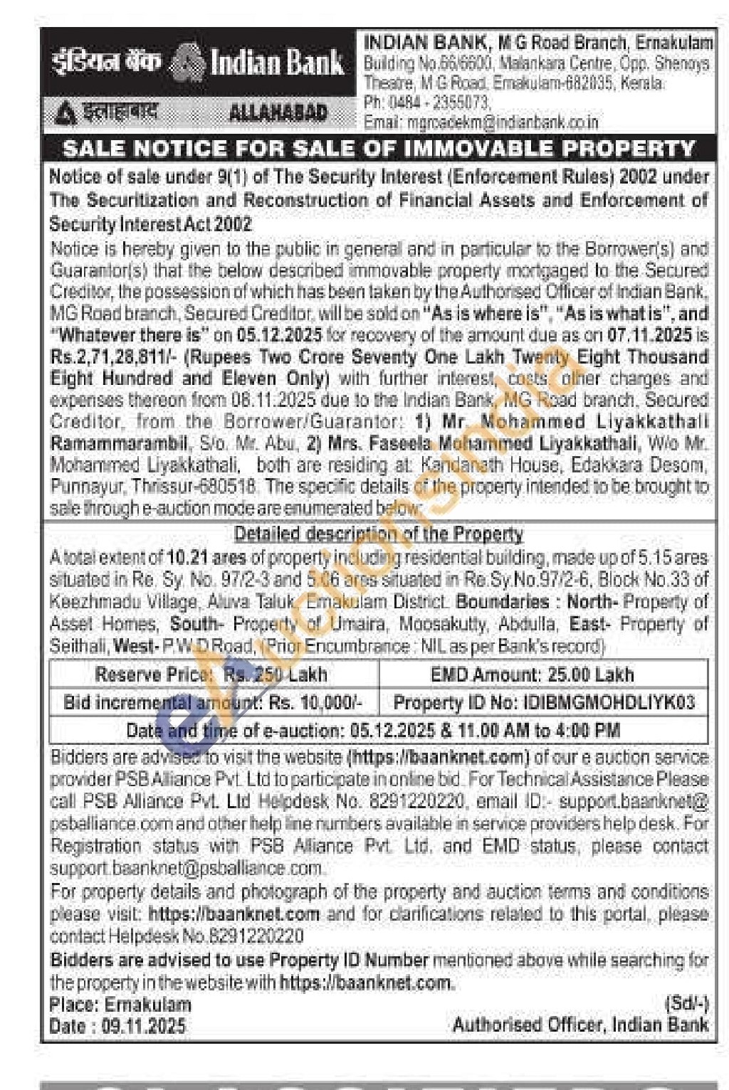 A total extent of 10.21 ares of property including residential building, made up of 5.15 ares situated in Re. Sy No. 97/2-3 and 5.06 ares situated in Re. Sy.No.97/2-6, Block No.33 of Keezhmadu Village, Aluva Taluk, Emakulam District. Boundaries: North- Property of Asset Homes, South Property of Umaira, Moosakutty, Abdulla, East- Property of Seithali, West-P.W.D Road, (Prior Encumbrance: NIL as per Bank's record)