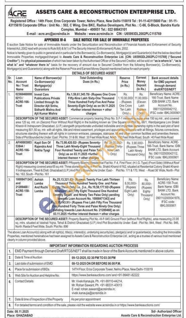 DESCRIPTION OF THE SECURED ASSET: Commercial property bearing Shop No. S.F-1 measuning super area 150 sq mir, and covered area 1200 sq mtr. on (Second Floor Without Roof Right) in the building known as One Square on Plot No. 88/1, Wardipargana Loni Shakti Khand-Ill Indrapuram Ghaziabad, (UP) alongwith proportionate undivided indivisible and impartible ownership rights in the said plot of land measuring 801.50 sq. mtr with all rights, tilde and intrest easement, privileges and appurtenance thereto with all fittings, fixtures connections, structures standing thereon with all rights in common entraces, passages, staircase, lift and other common facilities and amenities thereon. Side of Plat Bounded As Under: East: Plot No. 31 & 68, West-30 Feet Wide Road, North: 150 Feet Wide Road, South: 40 Feet Wide Road 2 AFH0003003 53844/ACRE-166-Trust Kapil Son Of Rajendra And Rekha Tyagi Only) as on 03.11.2025 +further Rs.73.98.420.02)- (Rupees Seventy-