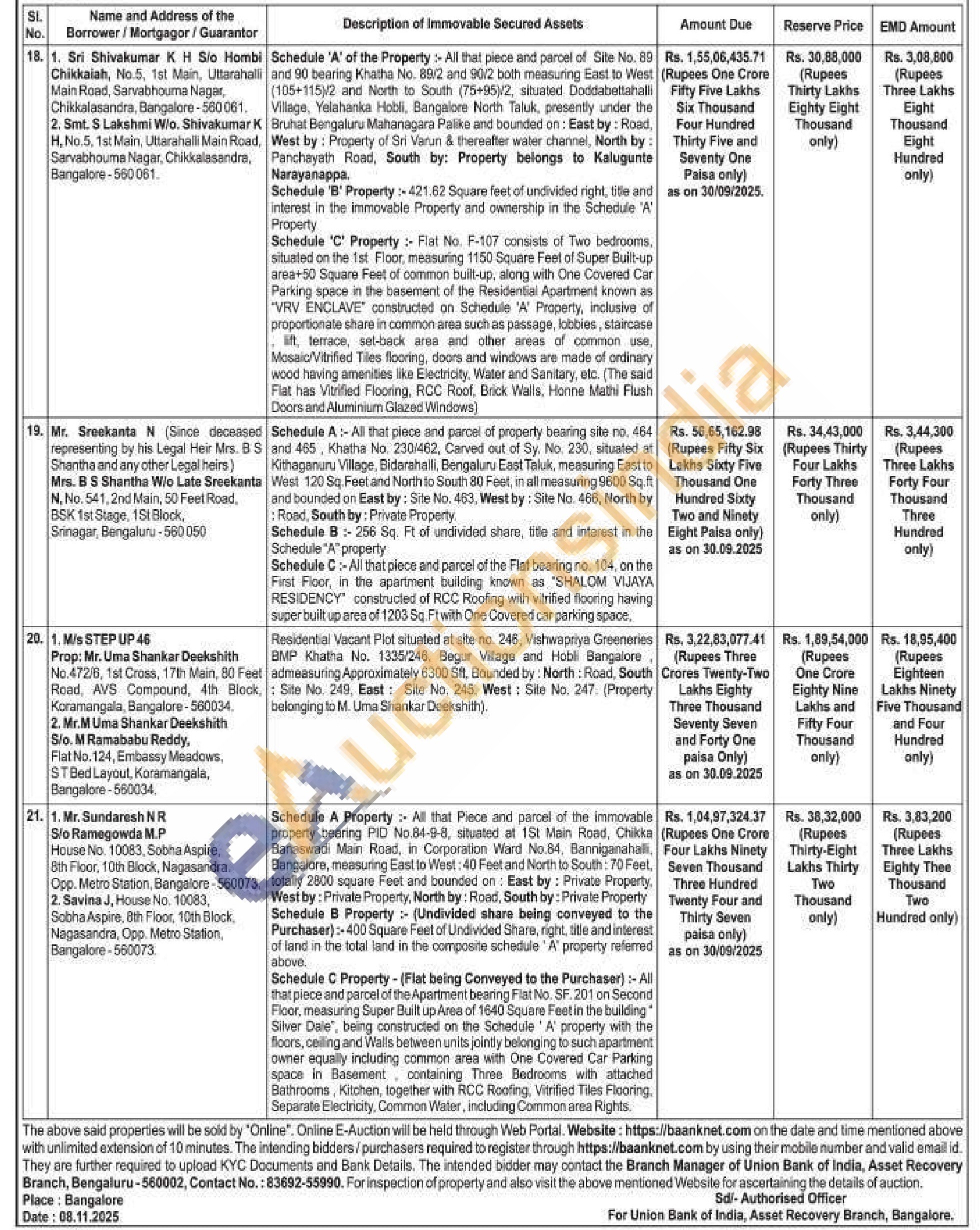 1) SCHEDULE "A" PROPERTY: All that piece and parcel of the rear portion of residential premises being corporation new no. B-1/8, Queens road (Sweepers colony) Formerly Corporation quarters No 8 Block 1. Thimmaiah Road, Bangalore measuring East to west 12ft 6 inches, North to South 16ft 9 inches together with ground, first and second floor building standing thereon and bounded on the East: Quarter No. 9. West: Passage, North: Quarter No. 7, South: Passage, SCHEDULE "B" PROPERTY :- All that piece and parcel of the property consisting of land and residential house in Ground floor bearing corporation quarters No 8 Block No. 1 Thimmaiah road, Bangalore measuring East to West 12ft 6 inches, North to South: 16 Ft 9 Inches ad measuring 209.37 sq ft together with all rights, Appurtenances and 50% undivided right in the schedule equivalent to 69.78 sq ft schedule herein and bounded on East: Quarter No. 9, West: Passage, North: Quarter No. 7, South: Passage.
