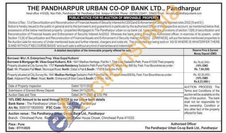 Property situated at City Survey No. 1641 Madhav Heritage Sadashiv Peth Pune Flat No. 01. which Area 609 Sq. Feet. Four Boundries as under East: Adjacent Flat, West: Road North: Entrance/Lift Stair Case & South: CTS No. 1639