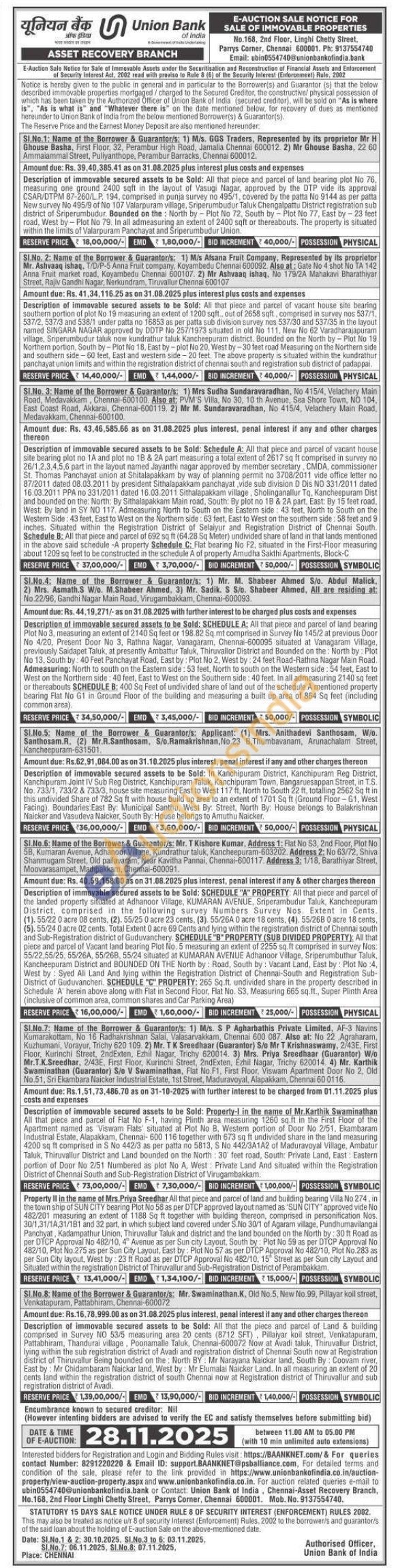 8) All that the piece and parcel of Land & building comprised in Survey NO 53/5 measuring area 20 cents (8712 SFT), Pillaiyar koil street, Venkatapuram, Pattabhiram, Thandurai village. Poonamalle Taluk, Chennai-600072 Now at Avadi taluk, Thiruvallur District, lying within the sub registration district of Avadi and registration district of Chennal South now at Registration district of Thiruvallur Being bounded on the North BY: Mr Narayana Naickar land, South By: Coovam river, East by: Mr Chidambaram Naickar land, West by: Mr Elumalai Naicker Land. In all measuring an extent of 201 cents land within the registration district of south Chennai now at Registration district of Thiruvallur and sub registration district of Avadi.