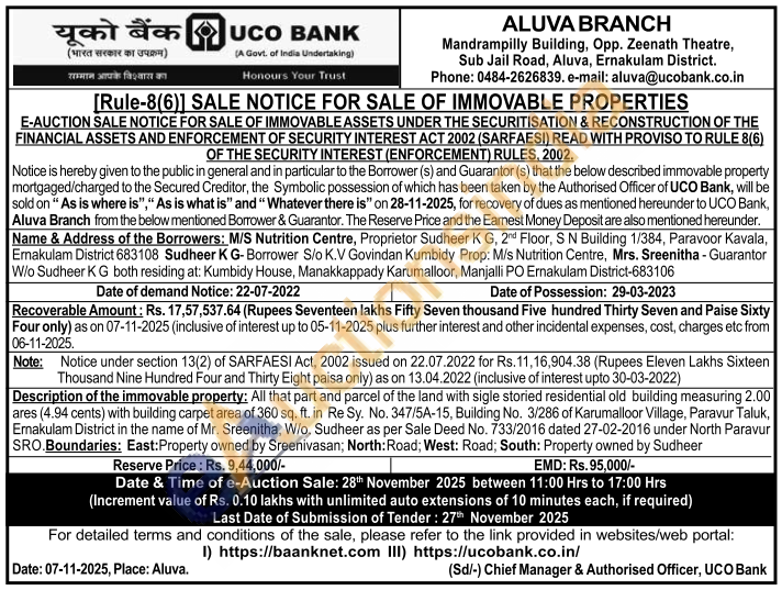 Description of the immovable property: All that part and parcel of the land with sigle storied residential old building measuring 2.00 ares (4.94 cents) with building carpet area of 360 sq. ft. in Re Sy. No. 347/5A-15, Building No. 3/286 of Karumalloor Village, Paravur Taluk, Ernakulam District in the name of Mr. Sreenitha, W/o. Sudheer as per Sale Deed No. 733/2016 dated 27-02-2016 under North Paravur SRO.Boundaries: East: Property owned by Sreenivasan; North: Road; West: Road; South: Property owned by Sudheer