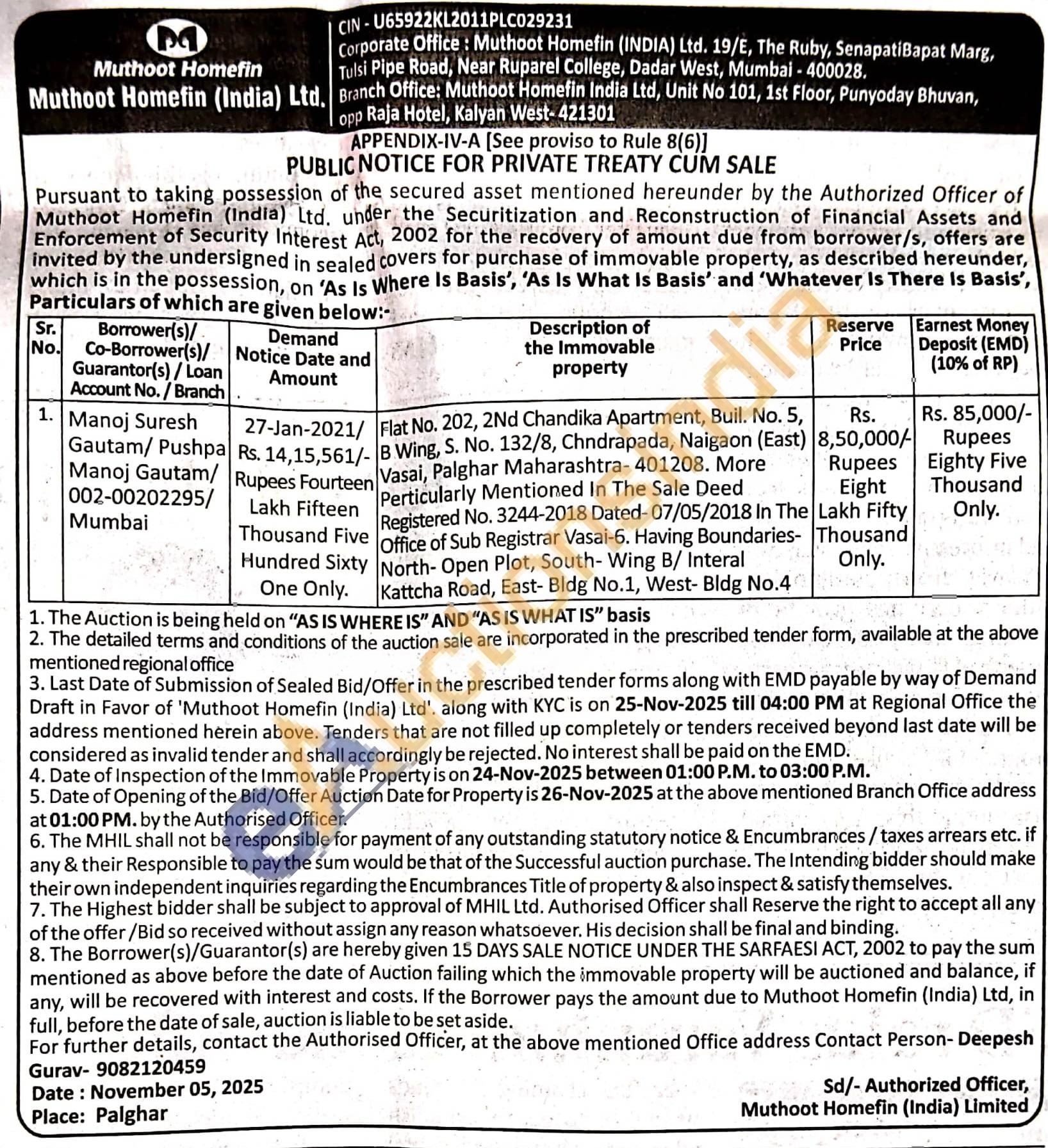 Flat No. 202, 2Nd Chandika Apartment, Buil. No. 5, B Wing, S. No. 132/8, Chndrapada, Naigaon (East) Vasai, Palghar Maharashtra- 401208. More Perticularly Mentioned In The Sale Deed Registered No. 3244-2018 Dated-07/05/2018 In The Office of Sub Registrar Vasai-6. Having Boundaries-North- Open Plot, South-Wing B/ Interal Kattcha Road, East- Bldg No.1, West- Bldg No.4