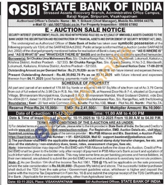 All part and parcel of an extent of 178.88 Sq. Yards or equal to 149.57 Sq.Mts of site from out of Ac. 3.79 Cents from out of fuil extent of Ac.3.98 Cts in R.S. No. 164, Plot No. 7B, at Nearest Door No 8-7-4, situated at Gunupudi Village, Bhimavaram Muncipal Area, Gunupudi S.R.O. Bhimavaram Mandal, West Godavari District, vide Doc No.4504/2017, dated 11.09.2017 in the name of Chukka Uma Maheswara Rao, Sio. Ranga Rao, with the following Boundaries: East: 20 feet wide Common Way, South: Plot No. 138, West: Plot No.89, North: Plot No.7.A.