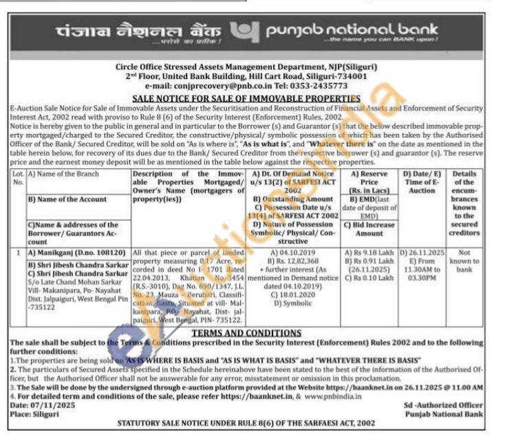 All that piece or parcel of landed property measuring 0.17 Acre, re-corded in deed No 1- 1701 dated 22.04.2013, Khatian No.-3454 (RS-3010), Dag No. 690/1347, J.L. No. 23, Mauza Berubari, Classifi cation: Bastu, Situated at vill Mal-kanipara, PO- Nayahat, Dist jal paiguri, West Bengal, PIN-735122.