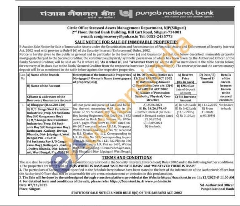 All that piece and parcel of Land and build ing thereon measuring 0.09 acre in the name of Sri Sushanta Roy S/o Gangaram Roy having Registered Gift Deed No. 1-652 recorded in Book No. 1, Volume No. 0706-2017, pages from 8989 to 9001 dated 06-04-2017 executed before ADSR, Dhupguri, Within Mouza-Gadang, JL. No. 99, recorded in R.S. Khatian No. 112, Corresponding to L.R. Khatian No. 947, Corresponding to pre sent LR Khatian No. 1121 RS Plot no 766 corresponding to LR. Plot no 1430, Within the limits of Gagang-1 Gram Panchayet area, PS-Dhupguri, Dist- Jalpaiguri West Bengal.