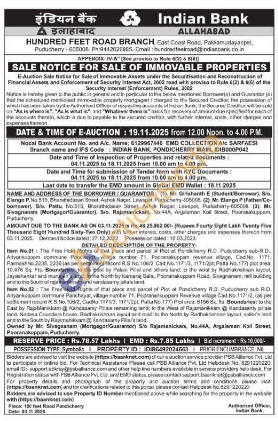 Item No.01: The Free Hold Rights of that piece and parcel of Plot at Pondicherry R.D. Puducherry sub-R.D.. Ariyankuppam commune Panchayat, village number 71, Pooranakuppam revenue village, Cad. No. 1171, PaimashNo.2235, 2236 (as per settlement record R.S.No. 106/2, Cad. No. 1171/3, 1171/2pt; Patta No. 177) plot area: 10,476 Sq. Fts. Boundaries: to the East by Palani Pillai and others land, to the west by Radhakrishnan layout, Jayashankar and murugan's land; to the North by Kamaraj Salai, Pooranakuppam Road, Sivagnanam; mill building and to the South of rajamanikkam and kandasamy pillais land. Item No.02: The Free Hold Rights of that piece and parcel of Plot at Pondicherry R.D. Puducherry sub R.D. Ariyankuppam commune Panchayat, village number 71, Pooranankuppam Revenue village Cad. No. 1171/2, (as per settlement record R.S.No. 106/2, CadNo. 1171/3, 1171/2pt: Patta No.177) Plot area: 6156 Sq. fts. Boundaries: to the East by RajaManikkam @ Kandasamy Pillais remaining land; to the West of Rajamanikkam @ Kandasamy pillais land, Nadesa Counders house, Radhakrishnan layout and road; to the North by Radhakrishnan layout, seller's land and to the South by Rajamanikkam @ Kandasamy Pillai's land. Owned by Mr. Sivagnanam (Mortgagori Guarantor) S/o Rajamanickam, No.44A, Argalaman Koil Street, Pooranakuppam, Puducherry.