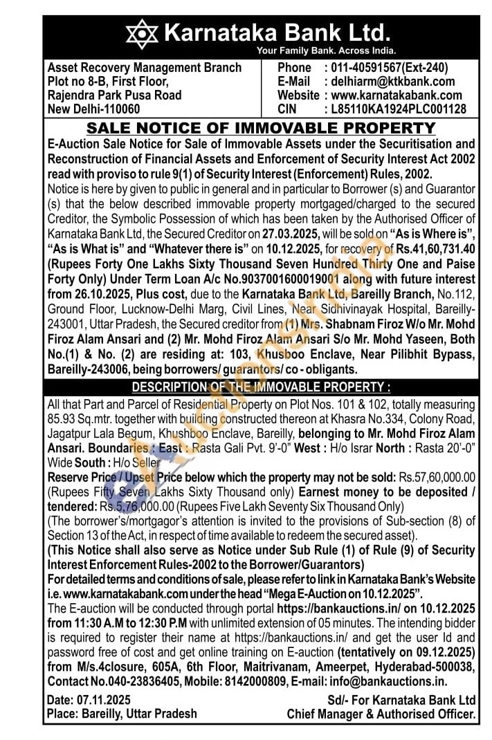 All that Part and Parcel of Residential Property on Plot Nos. 101 & 102, totally measuring 85.93 Sq.mtr. together with building constructed thereon at Khasra No.334, Colony Road, Jagatpur Lala Begum, Khushboo Enclave, Bareilly, belonging to Mr. Mohd Firoz Alam Ansari. Boundaries: East: Rasta Gali Pvt. 9'-0" West: H/o Israr North: Rasta 20'-0" Wide South: H/o Seller