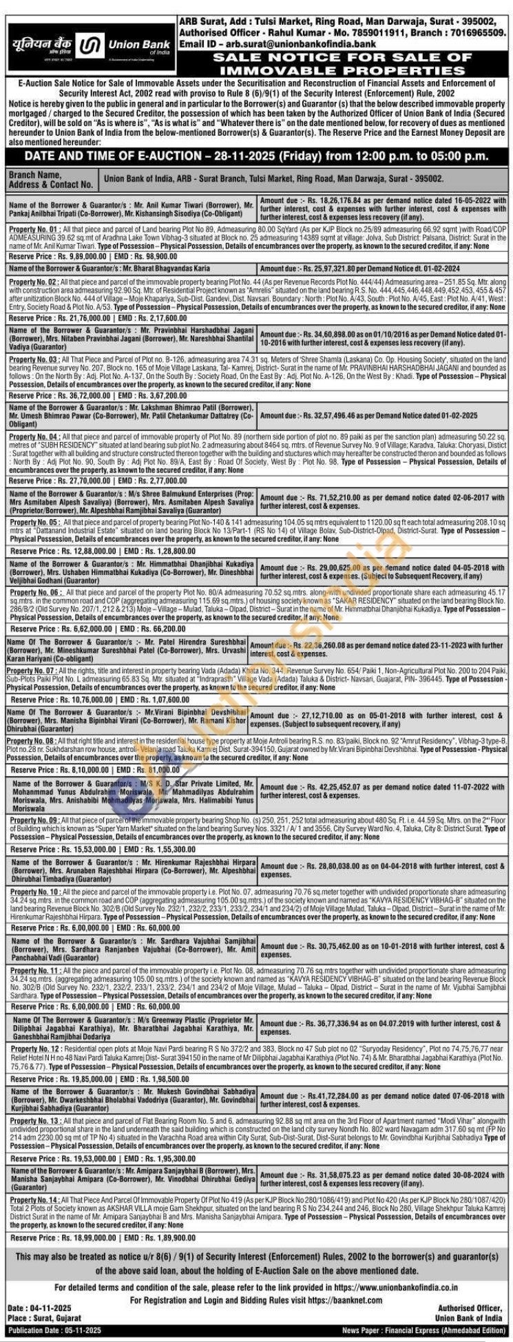 Property No. 07: All the rights, title and interest in property bearing Vada (Adada) Khata No. 344, Revenue Survey No. 654/Paiki 1, Non-Agricultural Plot No. 200 to 204 Paiki, Sub-Plots Paiki Plot No. L admeasuring 65.83 Sq. Mtr. situated at "Indraprasth Village Vada (Adada) Taluka & District- Navsari, Guajarat, PIN-396445. Type of Possession -Physical Possession, Details of encumbrances over the property, as known to the secured creditor, if any: None