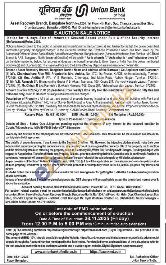 Description of Property: All that part and parcel of property bearing Industrial land and Rice mill building with Plant and Machinery situated at Plot No. 17-C, Part of Survey No.6, Industrial Area, Antharasanahalli, Kasaba Hobli, Tumkur Taluk, Tumkur District measuring 5155 Sq Mtrs owned by Mis Chandradhara Rice Mill represented by Smt. Anitha, Proprietrix and bounded on Eastby: Plot No. 178, West by: Plot No. 18, North by: KIADB Service Road, South by: Government Land.