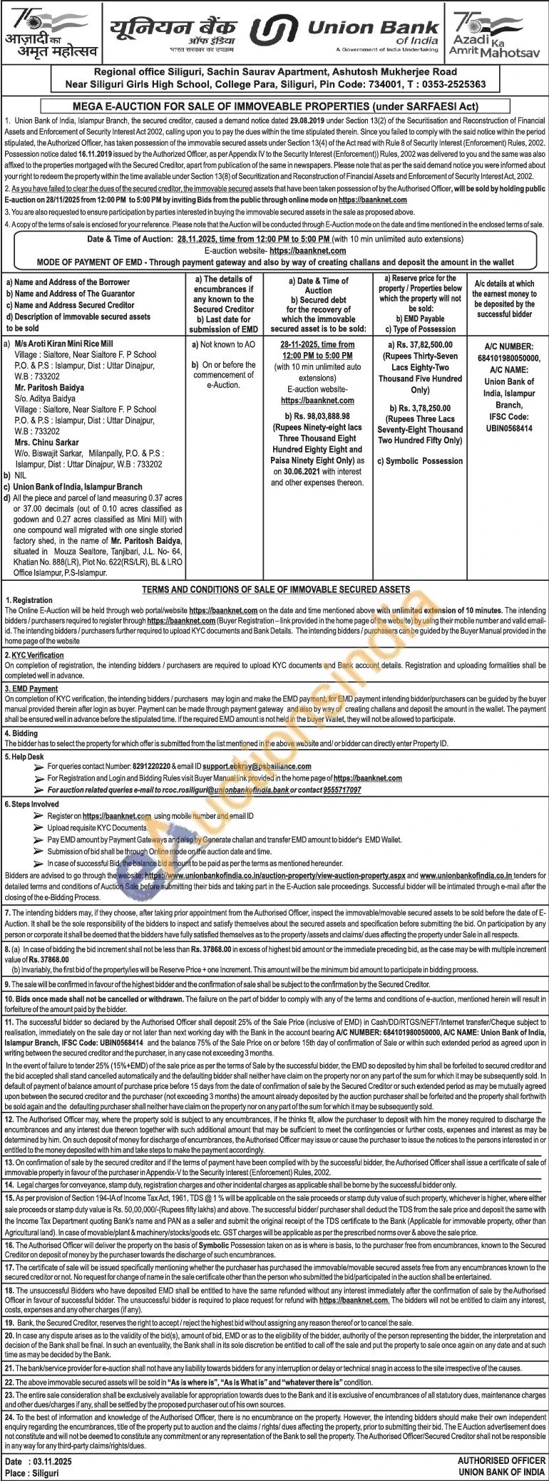 All the piece and parcel of land measuring 0.37 acres or 37.00 decimals (out of 0.10 acres classified as godown and 0.27 acres classified as Mini Mill) with one compound wall migrated with one single staried factory shed, in the name of Mr. Paritosh Baidya, situated in Mouza Sealtore, Tanjibari, J.L. No- 64, Khatian No. 888(LR), Plot No. 622(RS/LR), BL & LRO Office Islampur, P.S-Islampur
