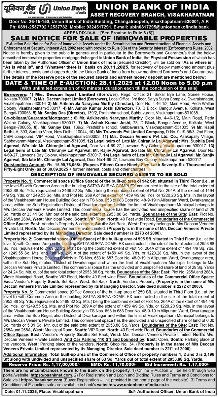 Property No. 1: Commercial space (Office Space) of the built-up area of 942 Sft. situated in Third Floor (i.e., at the level-5) with Common Area in the building SATYA SURYA COMPLEX constructed in the site of the total extent of 2953.88 Sq. Yds. (equivalent to 2469.82 Sq. Mts.) being the combined extent of Plot No. 264A of the extent of 1494 4/9 Sq. Yds. or 1249.55 Sq. Mts. and Plot No. 269 A of the extent of 1459 4/9 Sq. Yds, or 1220.28 Sq. Mts. in the layout of the Visakhapatnam House Building Society in TS Nos. 653 to 683 Door No. 48-9-19 in Allipuram Ward, Dwarkanagar area, within the Sub Registration District of Dwarkanagar and within the limit of Visakhapatnam Municipal belongs to M/s Deccan Veneers Private Limited. This commercial space has the undivided and unspecified share of land of 28 Sq. Yards or 23.41 Sq. Mtr. out of the said total extent of 2953.88 Sq. Yards. Boundaries of the Site: East: Plot No. 265A and 268A, West: Municipal Road, South: VIP Road, North: 40 Feet wide Road. Boundaries of the Commercial Office Space: East: Vendor's Property & corridor, South: Set Back, West: Property belongs to M/s Deccan Veneers Private Ltd, North: M/s Deccan Veneers Private Limited. (Property is in the name of M/s Deccan Veneers Private Limited represented by its Managing Director. Sale deed number is 2273 of 2000). Property No. 2: Commercial space (Office Space) of the built-up area of 995 Sft. situated in Third Floor (i.e., at the level-5) with Common Area in the building SATYA SURYA COMPLEX constructed in the site of the total extent of 2953.88 Sq. Yds. (equivalent to 2469.82 Sq. Mts.) being the combined extent of Plot No. 264A of the extent of 1494 4/9 Sq. Yds. or 1249.55 Sq. Mts. and Plot No. 269 A of the extent of 1459 4/9 Sq. Yds. or 1220.28 Sq. Mts. in the layout of the Visakhapatnam House Building Society in TS Nos. 653 to 683 Door No. 48-9-19 in Allipuram Ward, Dwarkanagar area, within the Sub Registration District of Dwarkanagar and within the limit of Visakhapatnam Municipal belongs to M/s Deccan Veneers Private Limited. This commercial space has the undivided and unspecified share of land of 29 Sq. Yards or 24.24 Sq. Mtr. out of the said total extent of 2953.88 Sq. Yards. Boundaries of the Site: East: Plot No. 265A and 268A, West: Municipal Road, South: VIP Road, North: 40 Feet wide Road. Boundaries of the Commercial Office Space: East: Vendor's Property, South: Set Back, West: Set Back, North: Vendor's Property. (Property is in the name of M/s Deccan Veneers Private Limited represented by its Managing Director. Sale deed number is 2272 of 2000). Property No. 3: Commercial space (Office Space) of the built-up area of 259 Sft. situated in Third Floor (i.e., at the level-5) with Common Area in the building SATYA SURYA COMPLEX constructed in the site of the total extent of 2953.88 Sq. Yds. (equivalent to 2469.82 Sq. Mts.) being the combined extent of Plot No. 264A of the extent of 1494 4/9 Sq. Yds. or 1249.55 Sq. Mts. and Plot No. 269 A of the extent of 1459 4/9 Sq. Yds. or 1220.28 Sq. Mts. in the layout of the Visakhapatnam House Building Society in TS Nos. 653 to 683 Door No. 48-9-19 in Allipuram Ward, Dwarkanagar area, within the Sub Registration District of Dwarkanagar and within the limit of Visakhapatnam Municipal belongs to M/s Deccan Veneers Private Limited. This commercial space has the undivided and unspecified share of land of 6.00 Sq. Yards or 5.01 Sq. Mtr. out of the said total extent of 2953.88 Sq. Yards. Boundaries of the Site: East: Plot No. 265A and 268A, West: Municipal Road, South: VIP Road, North: 40 Feet wide Road. Boundaries of the Commercial Office Space: East: Vendor's Property, South: Set Back, West: M/s. Deccan Veneers Private Limited, North: M/s. Deccan Veneers Private Limited. And Car Parking 110 Sft and bounded by: East: Open, South: Parking place of the vendors, West: Parking place of the vendors, North: Shop No. 34. (Property is in the name of M/s Deccan Veneers Private Limited represented by its Managing Director. Sale deed number is 2271 of 2000). Additional Information: Total built-up area of the Commercial Office of property numbers 1, 2 and 3 is 2,196 Sft along with undivided and unspecified share of 63 Sq. Yards out of total extent of 2953.88 Sq. Yards
