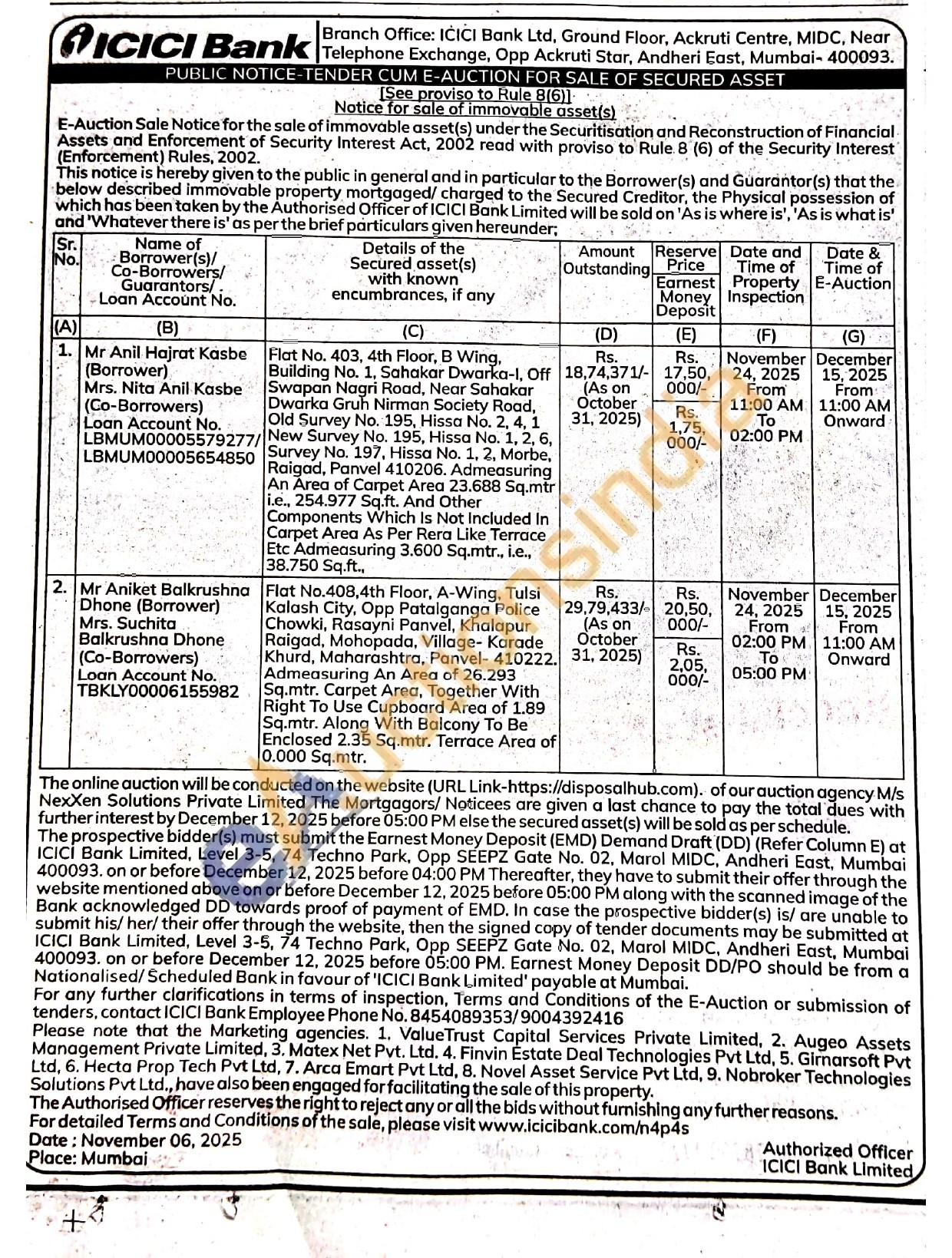 Flat No.408,4th Floor, A-Wing. Tulsi Kalash City, Opp Patalganga Police Chowki, Rasayni Panvel, Khalapur Raigad, Mohopada, Village- Karade Khurd, Maharashtra, Panvel-410222. Admeasuring An Area of 26.293 Sq.mtr. Carpet Area, Together With Right To Use Cupboard Area of 1.89 Sq.mtr. Along With Balcony To Be Enclosed 2.35 Sq.mtr. Terrace Area of 0.000 Sq.mtr