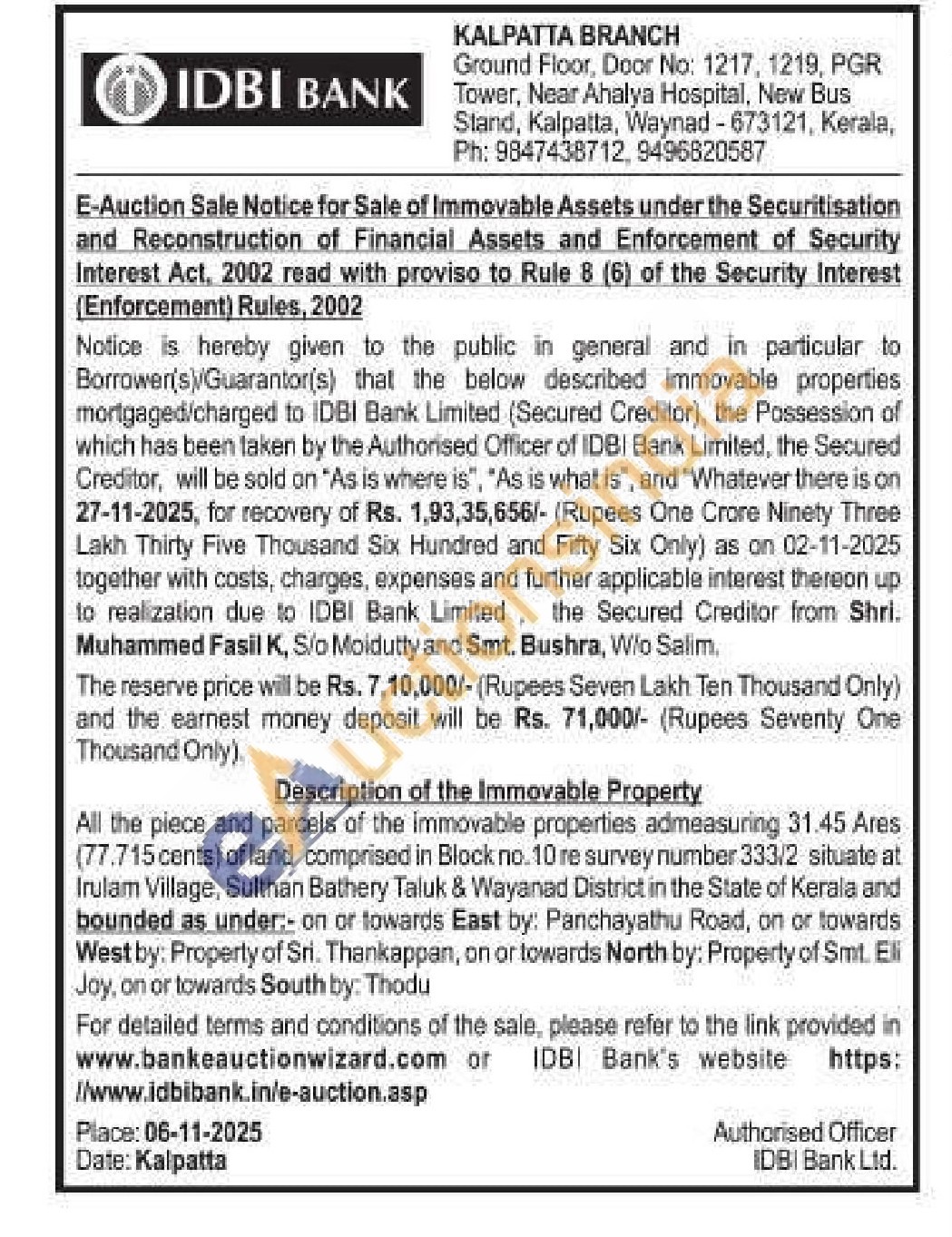 All the piece and parcels of the immovable properties admeasuring 31.45 Ares (77.715 cents) of land comprised in Block no. 10 re survey number 333/2 situate at Irulam Village, Sulthan Bathery Taluk & Wayanad District in the State of Kerala and bounded as under:- on or towards East by: Panchayathu Road, on or towards West by: Property of Sri. Thankappan, on or towards North by: Properly of Smt. Eli Joy, on or towards South by: Thodu