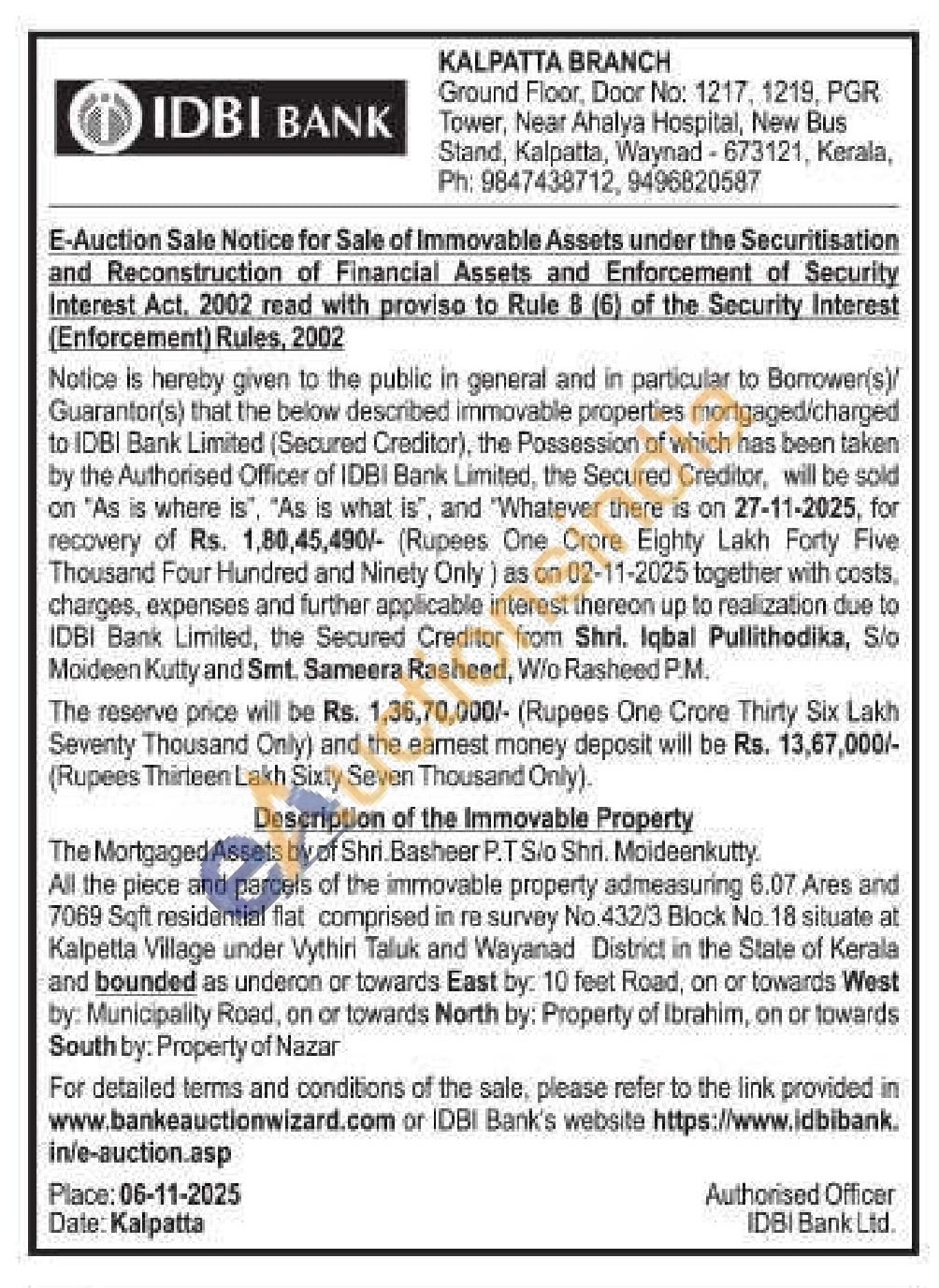 All the piece and parcels of the immovable property admeasuring 6.07 Ares and 7069 Sqft residential flat comprised in re survey No.432/3 Block No. 18 situate at Kalpetta Village under Vythiri Taluk and Wayanad District in the State of Kerala and bounded as underon or towards East by: 10 feet Road, on or towards West by: Municipality Road, on or towards North by: Property of Ibrahim, on or towards South by: Property of Nazar