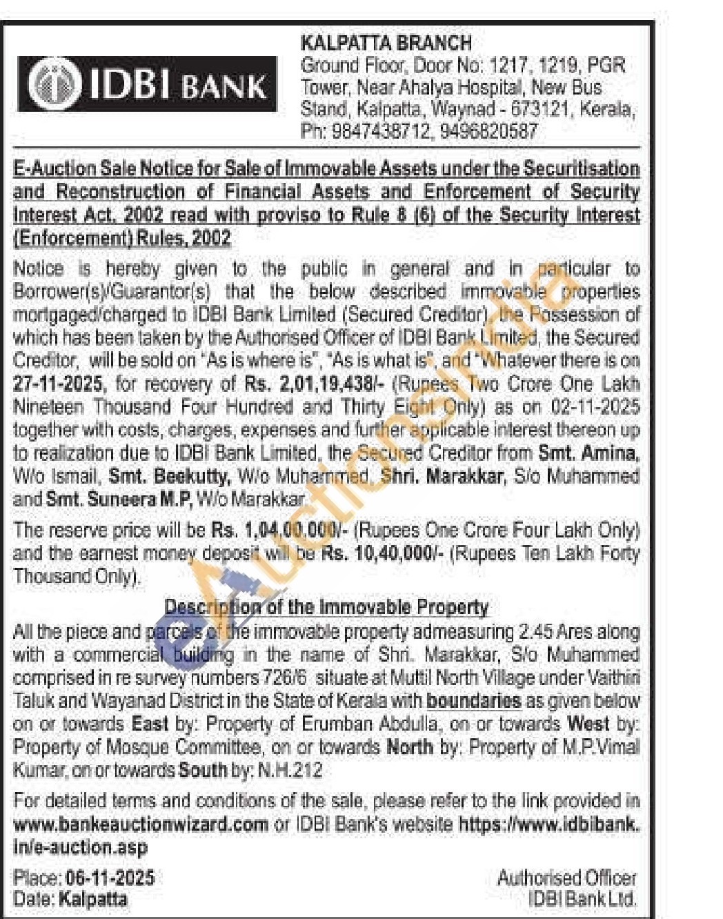 All the piece and parcels of the immovable property admeasuring 2.45 Ares along with a commercial building in the name of Shri. Marakkar, S/o Muhammed comprised in re survey numbers 726/6 situate at Muttil North Village under Vaithiri Taluk and Wayanad District in the State of Kerala with boundaries as given below on or towards East by: Property of Erumban Abdulla, on or towards West by: Property of Mosque Committee, on or towards North by: Property of M.P.Vimal Kumar, on or towards South by: N.H.212