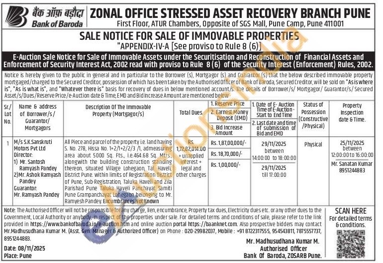 All Piece and parcel of the property le land having S. No. 278, Hissa No. 1+2/1+2/2/3 /1, admeasuring area about 5000 Sq. Fts, i.e.464.68 Sq. Mtrs, alongwith the building construction standing thereon, situated Village Lohegaon, Tal. Haveli District Pune within limits of Registration District of Pune, Sub Registration, Taluka Haveli and Zila Parishad Pune Taluka Haveli Panchayat Samiti Pune Grampanchayat Lohegaon belonging to Mr. Ramyesh Pandey Encumbrances Not Known