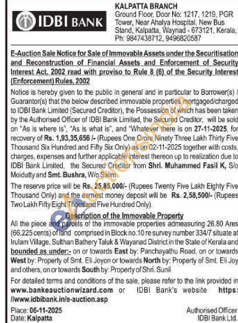 All the piece and parcels of the immovable properties admeasuring 26.80 Ares (66.225 cents) of land comprised in Block no. 10 re survey number 334/7 situate at Irulam Village, Sulthan Bathery Taluk & Wayanad District in the State of Kerala and bounded as under:- on or towards East by: Panchayathu Road, on or towards West by: Property of Smt. Eli Joyon or towards North by: Property of Smt. Eli Joy and others, on or towards South by: Property of Shri. Sunil