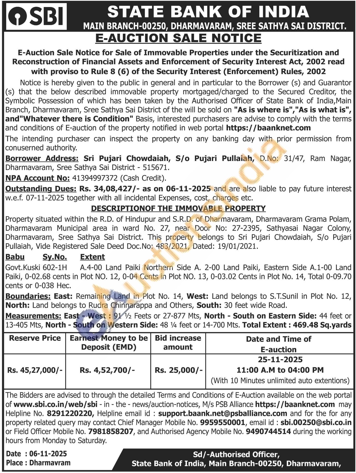 Property situated within the R.D. of Hindupur and S.R.D. of Dharmavaram, Dharmavaram Grama Polam, Dharmavaram Municipal area in ward No. 27, near Door No: 27-2395, Sathyasai Nagar Colony, Dharmavaram, Sree Sathya Sai District. This property belongs to Sri Pujari Chowdaiah, S/o Pujari Pullaiah, Vide Registered Sale Deed Doc. No: 483/2021, Dated: 19/01/2021. Babu Sy.No. Extent Govt. Kuski 602-1H A.4-00 Land Paiki Northern Side A. 2-00 Land Paiki, Eastern Side A.1-00 Land Paiki, 0-02.68 cents in Plot NO. 12, 0-04 Cents in Plot NO. 13, 0-03.02 Cents in Plot No. 14, Total 0-09.70 cents or 0-038 Нес.