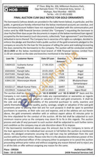 HDB Financial Services Limited Gold Auctions Auction in Angul