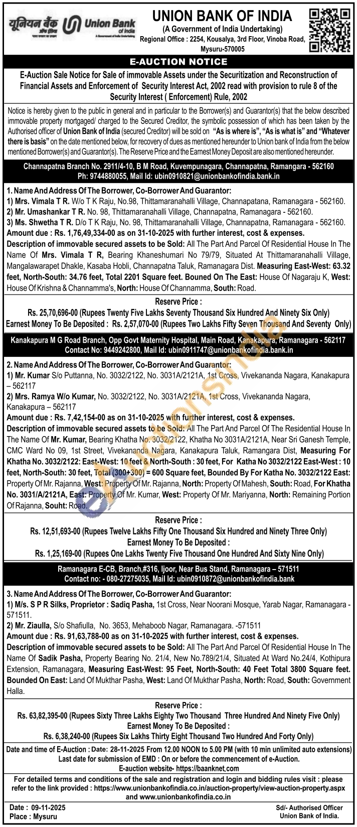 Description of immovable secured assets to be Sold: All The Part And Parcel Of Residential House In The Name Of Sadik Pasha, Property Bearing No. 21/4, New No.789/21/4, Situated At Ward No.24/4, Kothipura Extension, Ramanagara, Measuring East-West: 95 Feet, North-South: 40 Feet Total 3800 Square feet.. Bounded On East: Land Of Mukthar Pasha, West: Land Of Mukthar Pasha, North: Road, South: Government Halla.