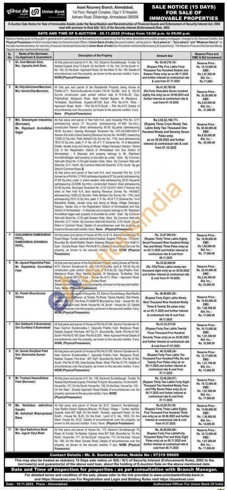 All that piece and parcel of House at Plot No E/194, Karmvir Sundervan-III, Near Karmvir Sundervatika-1. Opposite Prabhu Kutir, Manjipura Road. Nadiad, Gujarat. PlotArea-807 Sq. Ft. Bounded By, North-Plot No E/193, South-Plot No E/195, East-Plot No E/200, West-Approach Road Details of encumbrances over the property, as known to the secured creditor, if any: NONE (Physical Possession)
