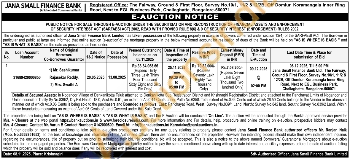 Details of Secured Assets: In Noganoor Village of Denkanikotta Taluk attached to Denkanikotta Sub Registration District and Krishnagiri Registration District and attached to the Panchayat Limits of Noganoor and Union council of Thally Sy.No.839/2, Dry.Ext. Hec.0. 18.0, Asst.Rs.0.61, an extent of Ac.0.44 Cents under Patta No.6358. Total extent of Ac.0.44 Cents out of which 26.50 Cents belongs to the Vendor in the aforesaid manner out of which Ac.0.06 Cents is being sold to the purchasers and Bounded as follows: East: Panchayat Road, West: Survey No.839/1 Land, North: Survey No.842 land, South: Survey No.839/2 Land. Within these boundaries measuring an extent of Ac.0.06 Cents of Land Covered under this Sale Deed