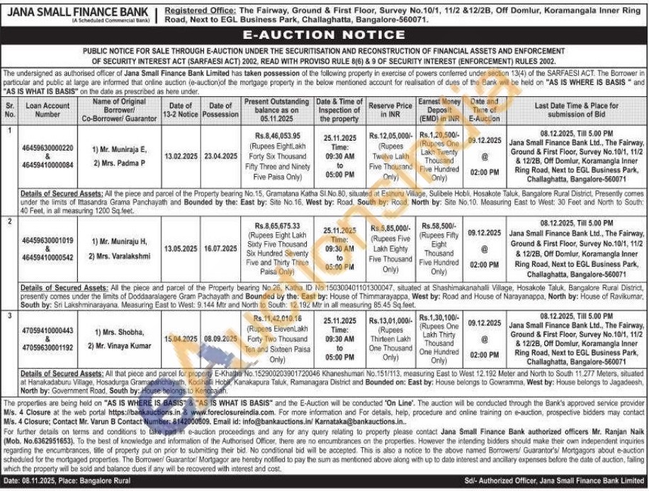 Details of Secured Assets: All the piece and parcel of the Property bearing No.26, Katha ID No.150300401101300047, situated at Shashimakanahalli Village, Hosakote Taluk, Bangalore Rural District, presently comes under the limits of Doddaaralagere Gram Pachayath and Bounded by the: East by: House of Thimmarayappa, West by: Road and House of Narayanappa, North by: House of Ravikumar, South by: Sri Lakshminarayana. Measuring East to West: 9.144 Mtr and North to South: 12.192 Mtr in all measuring 85.45 Sq feet
