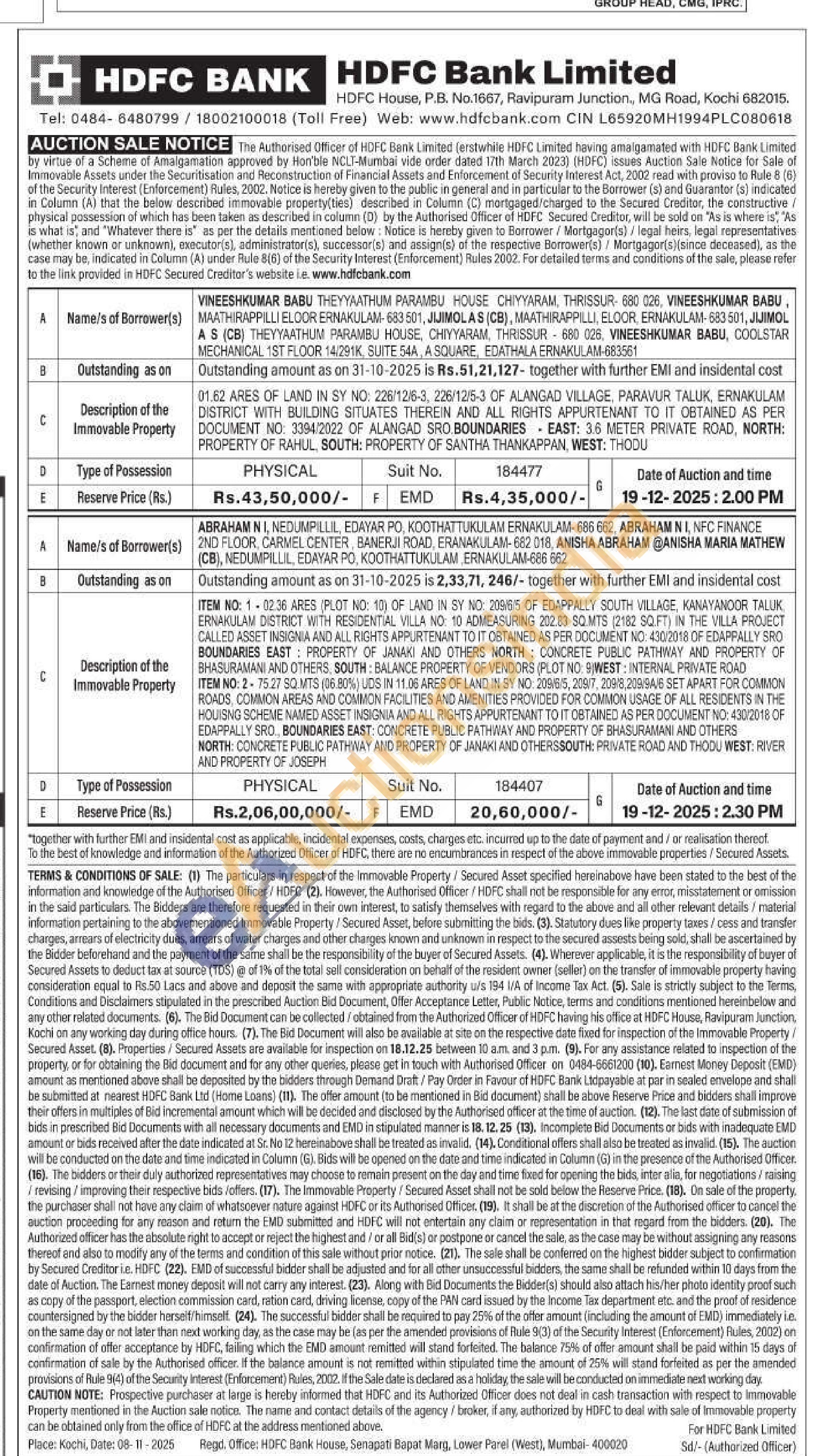 ITEM NO: 1-17:36 ARES (PLOT NO: 10) OF LAND IN SY NO 20995 OF EDAPPALLY SCUTH VILLAGE, KANAYANOOR TALIIK ERNAKULAM DISTRICT WITH RESIDENTIAL VILLA NO 10 ADMEASURING 20283 50 MTS (2182 SQ FT) IN THE VILLA PROJECT CALLED ASSET INSIGNIA AND ALL RIGHTS APPURTENANT TO IT OBTAINED AS PER DOCUMENT NO 430/2018 OF EDAPPALLY SRO BOUNDARIES EAST PROPERTY OF JANAKI AND OTHERS NORTH CONCRETE PUBLIC PATHWAY AND PROPERTY OF BHASURAMANI AND OTHERS, SOUTH BALANCE PROPERTY OF VENDORS (PLOT NO PIWEST: INTERNAL PRIVATE ROAD ITEM NO: 2-15.27 5QMTS (06.30%) UDS IN 11,06 ARES OF LAND IN SY NO: 209/8/5, 2007, 2008, 209/JA/6 SET APART FOR COMMON ROADS, COMMON AREAS AND COMMON FACILITIES AND AMEN TIES PROVIDED FOR COMMON USAGE OF ALL RESIDENTS IN THE HOUISNG SCHEME NAMED ASSET INSIGNIA AND ALL RIGHTS APPURTENANT TO IT OBTAINED AS PER DOCUMENT NO. 4301/2018 OF EDAPPALLY SRO BOUNDARIES EAST: CONCRETE PUBLIC PATHWAY AND PROPERTY OF BHASURAMANI AND OTHERS NORTH CONCRETE PUBLIC PATHWAY AND PROPERTY OF JANAKI AND OTHERSSOUTH: PRIVATE ROAD AND THODU WEST RIVER AND PROPERTY OF JOSEPH