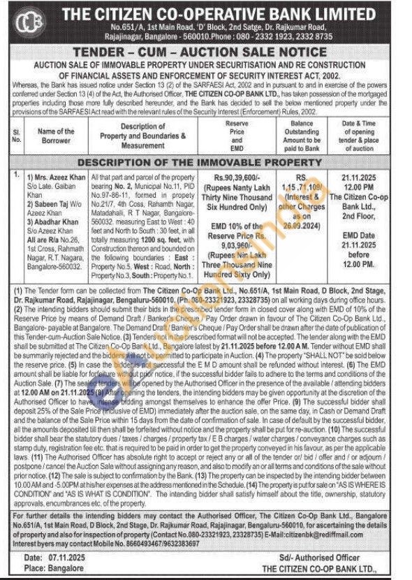 All that part and parcel of the property bearing No. 2, Municipal No.11, PID No.97-86-11, formed in propety No.21/7, 4th Coss, Rahamth Nagar, Matadahalli, RT Nagar, Bangalore-560032. measuring East to West: 40 feet and North to South: 30 feet, in all totally measuring 1200 sq. feet, with Construction thereon and bounded on the following boundaries: East: Property No.5. West: Road, North: Property No. 3, South: Property No.1.