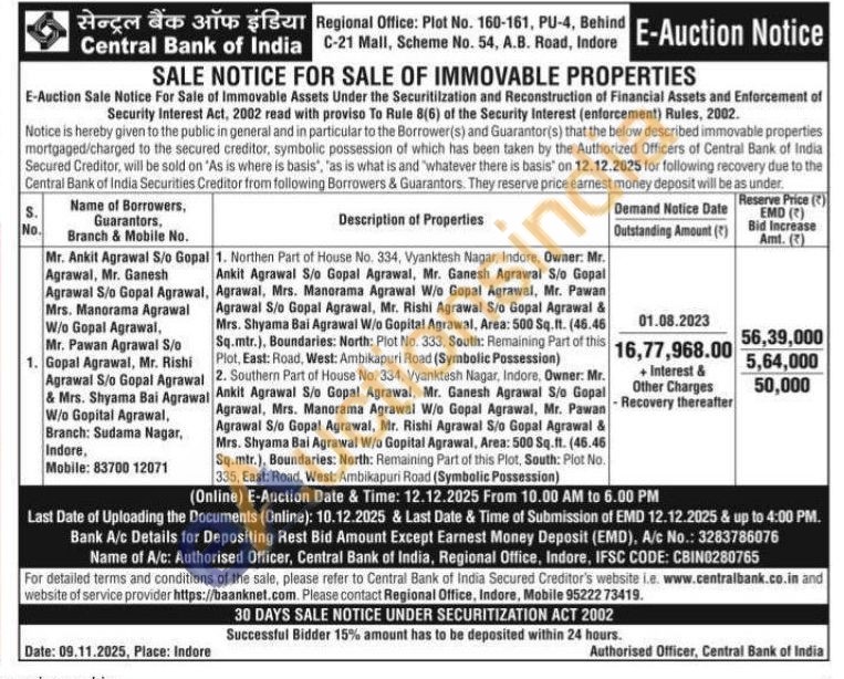 Northen Part of House No. 334, Vyanktesh Nagar, Indore, Owner: Mr. Ankit Agrawal S/o Gopal Agrawal, Mr. Ganesh Agrawal S/o Gopal Agrawal, Mrs. Manorama Agrawal W/o Gopal Agrawal, Mr. Pawan Agrawal S/o Gopal Agrawal, Mr. Rishi Agrawal S/o Gopal Agrawal & Mrs. Shyama Bai Agrawal W/o Gopital Agrawal, Area: 500 Sq.ft. (46.46) Plot, East: Road, West: Ambikapuri Road (Symbolic Possession) of this 2. Southern Part of House No. 334, Vyanktesh Nagar, Indore, Owner: Mr. Ankit Agrawal S/e Gopal Agrawal, Mr. Ganesh Agrawal S/o Gopal Agrawal, Mrs. Manorama Agrawal W/o Gopal Agrawal, Mr. Pawan Agrawal S/o Gopal Agrawal, Mr. Rishi Agrawal S/o Gopal Agrawal & Mrs. Shyama Bai Agrawal W/o Gopital Agrawal, Area: 500 Sq.ft. (46.46 Sq.mtr.), Boundaries: North: Remaining Part of this Plot, South: Plot No. 335, East: Road, West: Ambikapuri Road (Symbolic Possession)